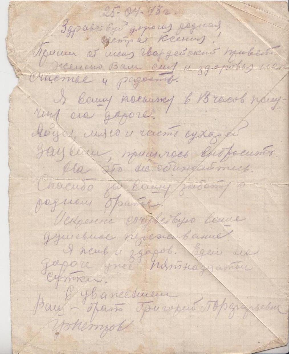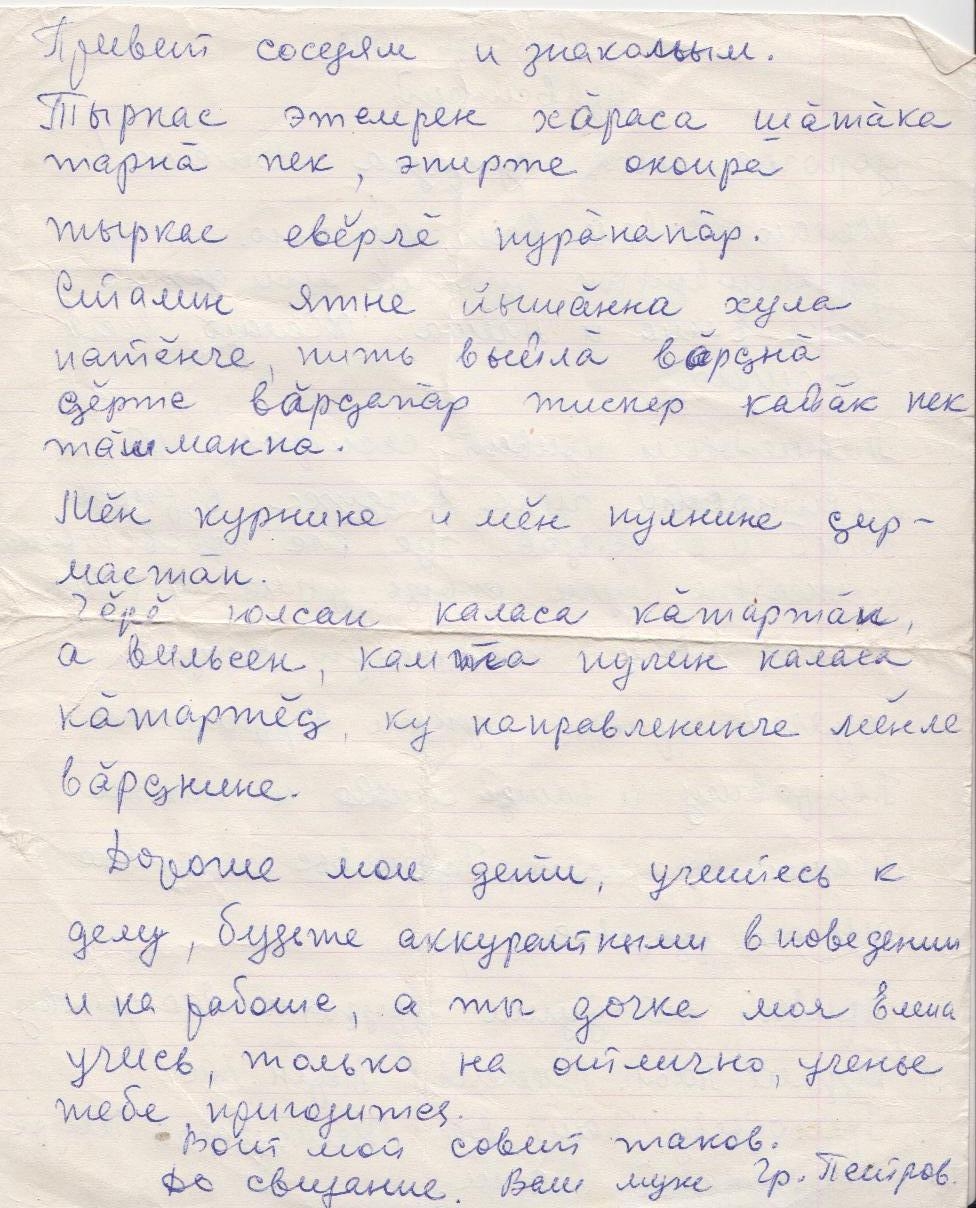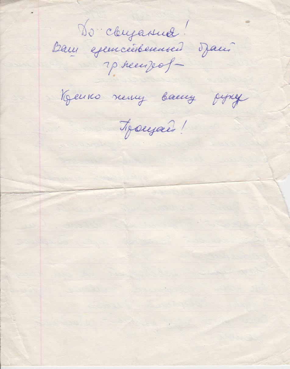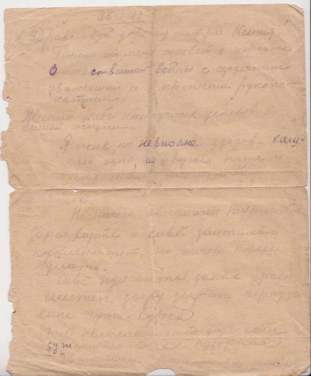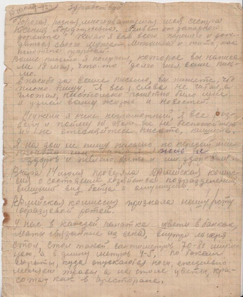 Из письма от 3 сентября 1943 года: «В дни тяжелых испытаний хочу написать письмо не чернилами, а слезами. У многих воинов сейчас или сестра, или брат, может быть, и мать страдают в жестокой неволе. Они переживают большое горе, большое унижение. Наш долг освободить их от немцев. Вы пока счастливо живете, хорошо, в руках Советской власти. Ваш долг перед Родиной – работать честно».