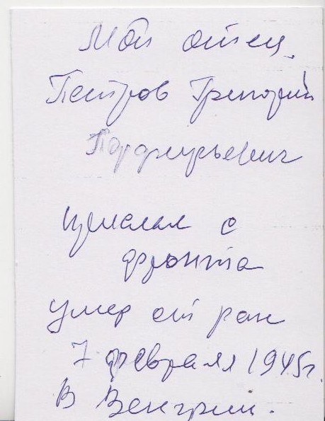 Григорий Порфирьевич Петров умер от ран 7 февраля 1945 г. в Венгрии. Других сведений нет.