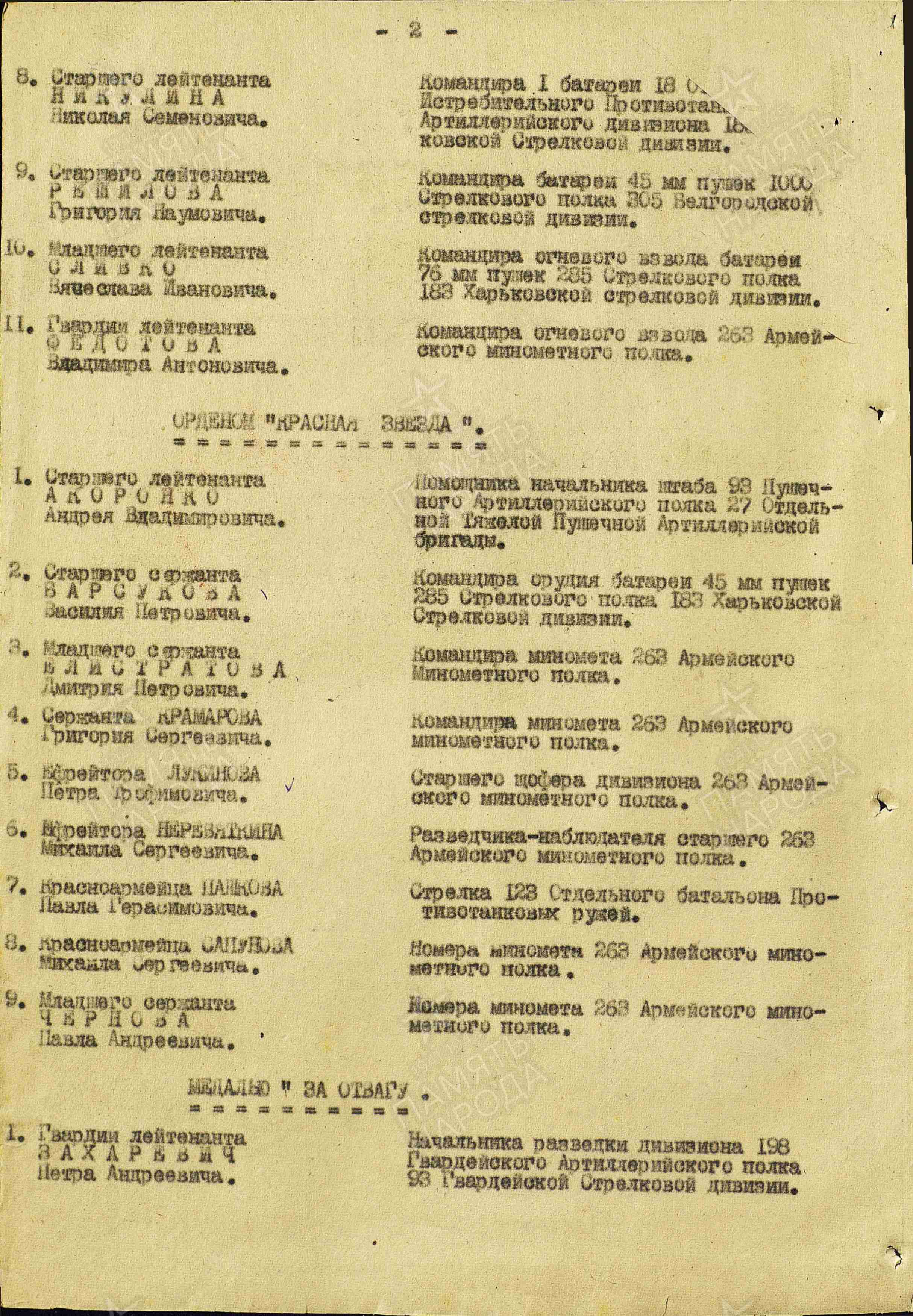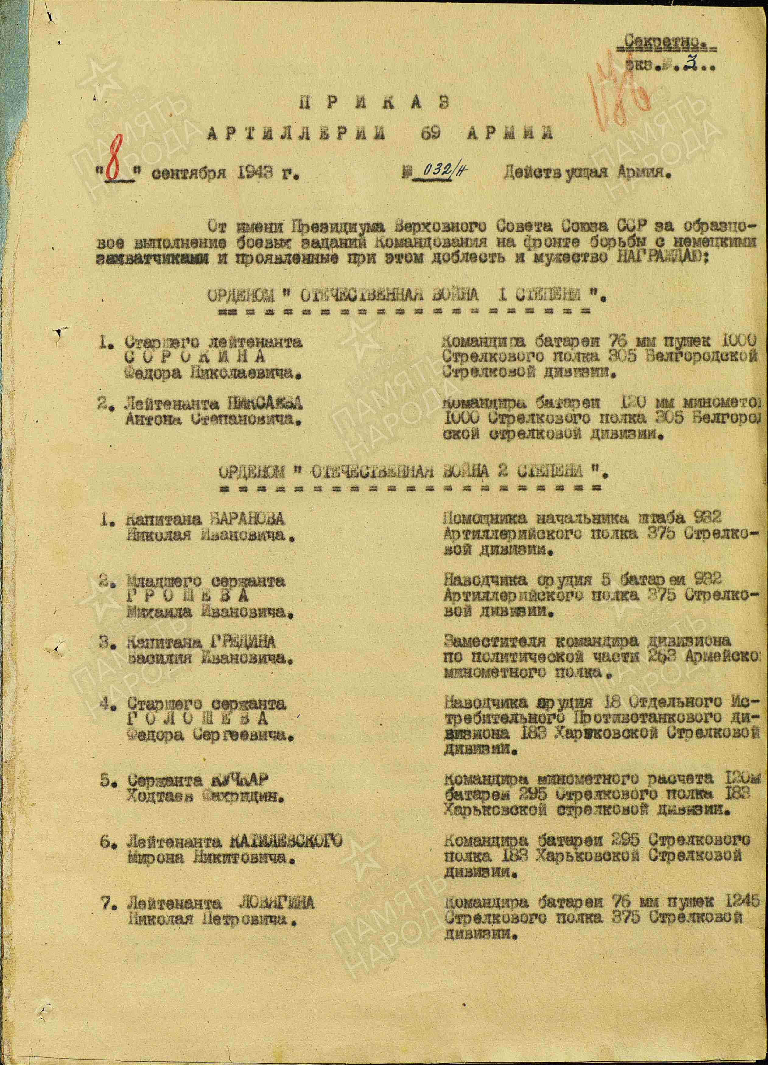 Информация из Наградного листа от 1 сентября 1943 год к ордену Красной Звезды: «В боях за социалистическую Родину за период с 5 июля по 30 августа с.г. на Белгородско-Харьковском направлении красноармеец-наводчик Сапунов показал образцы бесстрашия и точной стрельбы. За время боев огнем его миномета уничтожено свыше 100 гитлеровцев, разбито 2 автомашины и разрушен один ДЗОТ».
