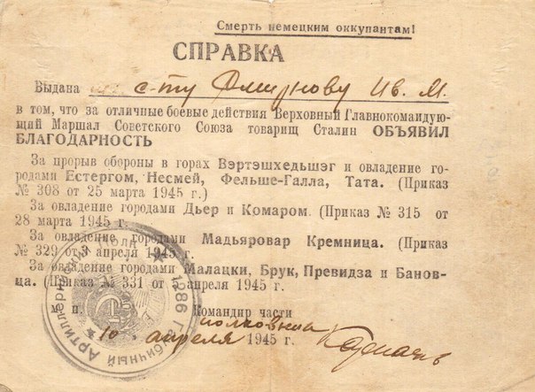 - за прорыв обороны в горах Вэртэшхедьшэг и овладение городами Естергом, Несмей, Фельше-Галла, Тата (Приказ № 308 от 25.03.1945 г.)