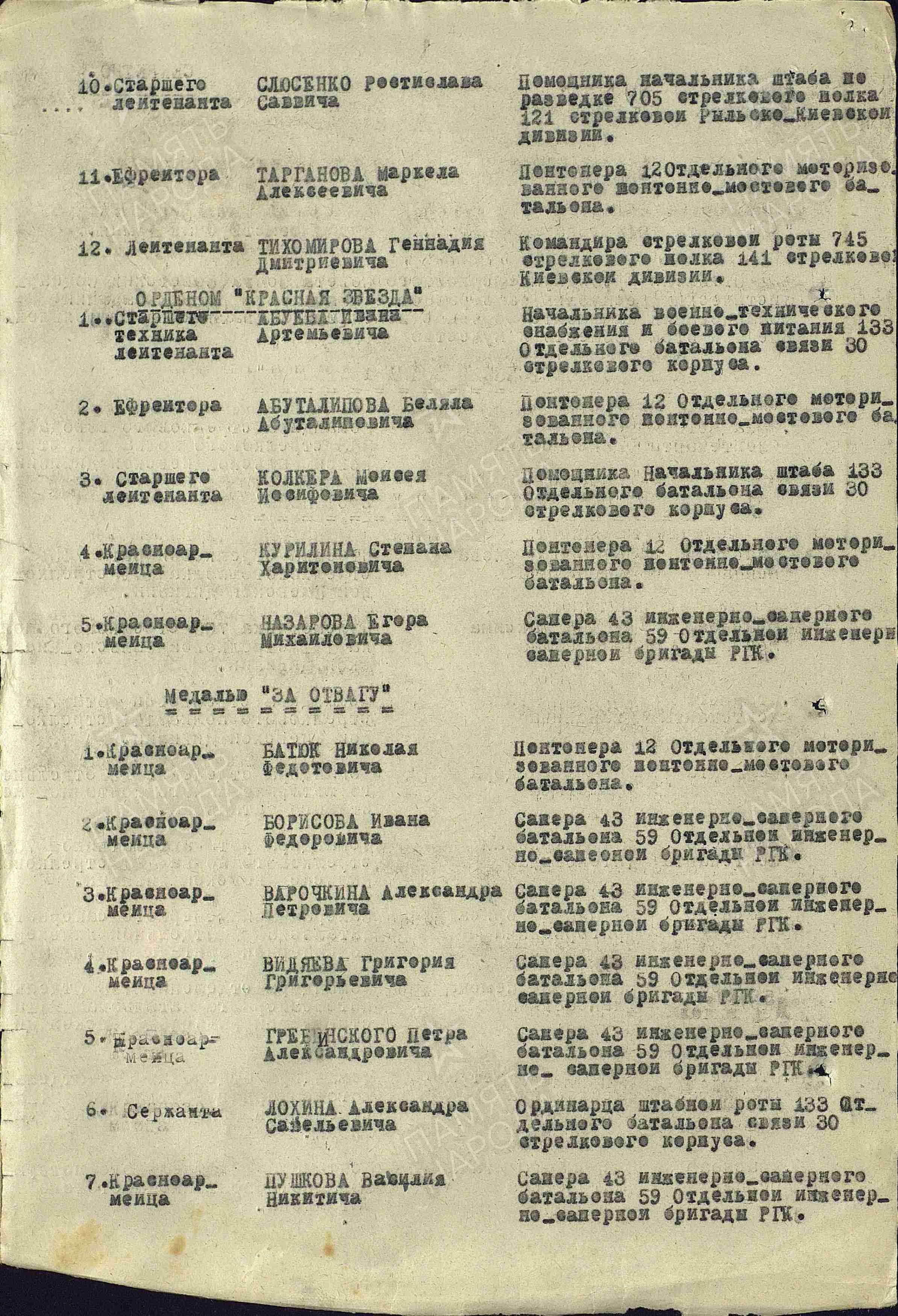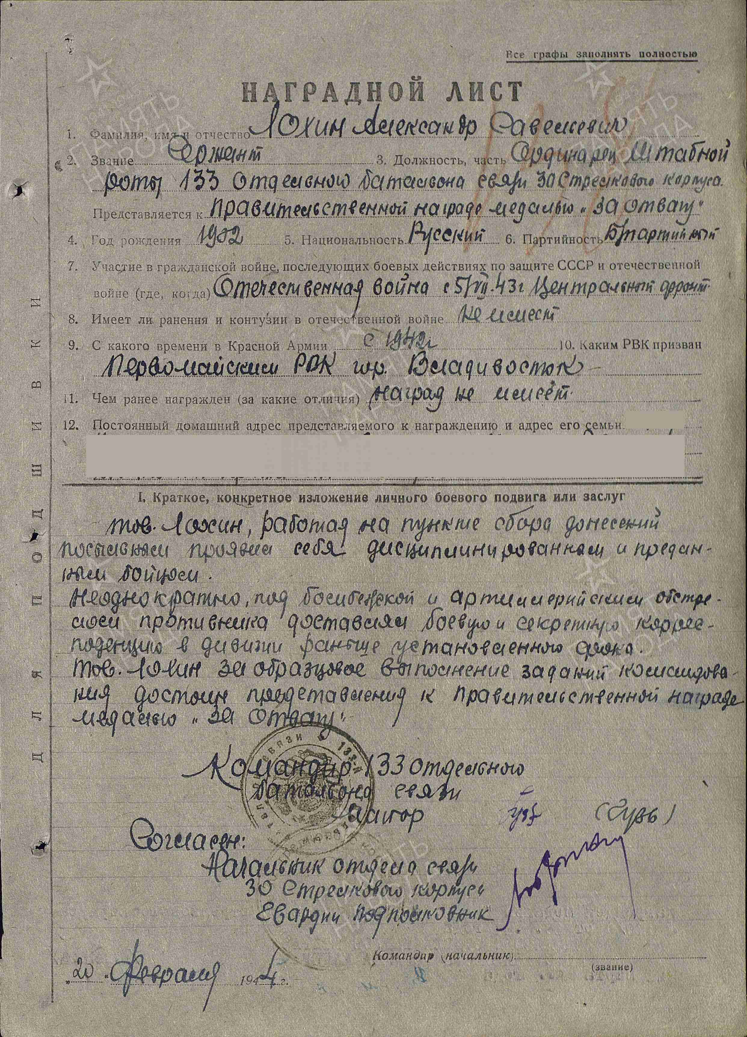 Информация из Наградного листа от 20 февраля 1944 года к медали «За отвагу»: «Тов. Лохин, работая на пункте сбора донесений посыльным, проявил себя дисциплинированным и преданным бойцом. Неоднократно под бомбежкой и артиллерийскими обстрелами противника доставлял боевую и секретную корреспонденцию в дивизии раньше установленного срока. За образцовое выполнение заданий командования достоин представления к правительственной награде – медали «За отвагу».