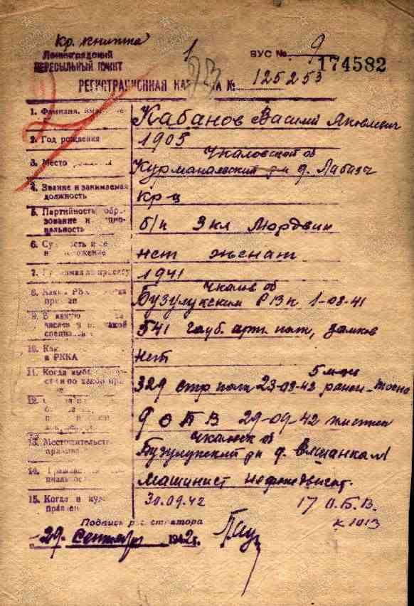 Участник Великой Отечественной войны. 1905 года рождения, уроженец села Лабазы Чкаловской (ныне Оренбургской) области. Был в учебке в городе Токсово Ленинградской области. В феврале 1942 г. был ранен, проходил лечение в Ленинградском госпитале в 6 отделении. Повторно был ранен 05 марта 1942 г. По информации из архивных документов Минобороны рядовой Василий Кабанов пропал без вести в марте 1943 года (Ленинградский фронт). Последнее место службы: Ленинградский фронт, полевая почтовая станция 121 часть 523.
