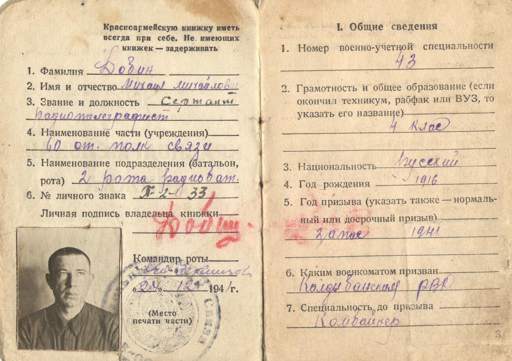 Информацию и документы предоставил сын Добин Валентин Михайлович, п. Гражданский Красноармейского района Самарской области