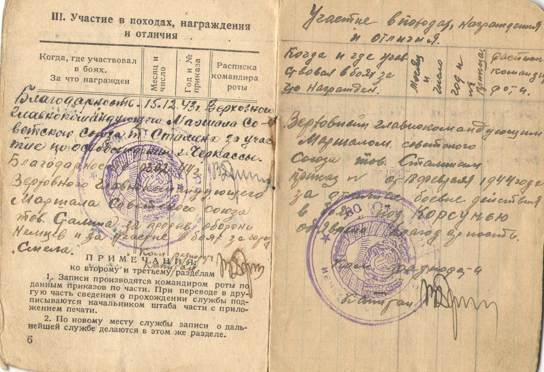 Благодарность 03.02.1944 года за прорыв обороны немцев и за участие в боях за город Смела;