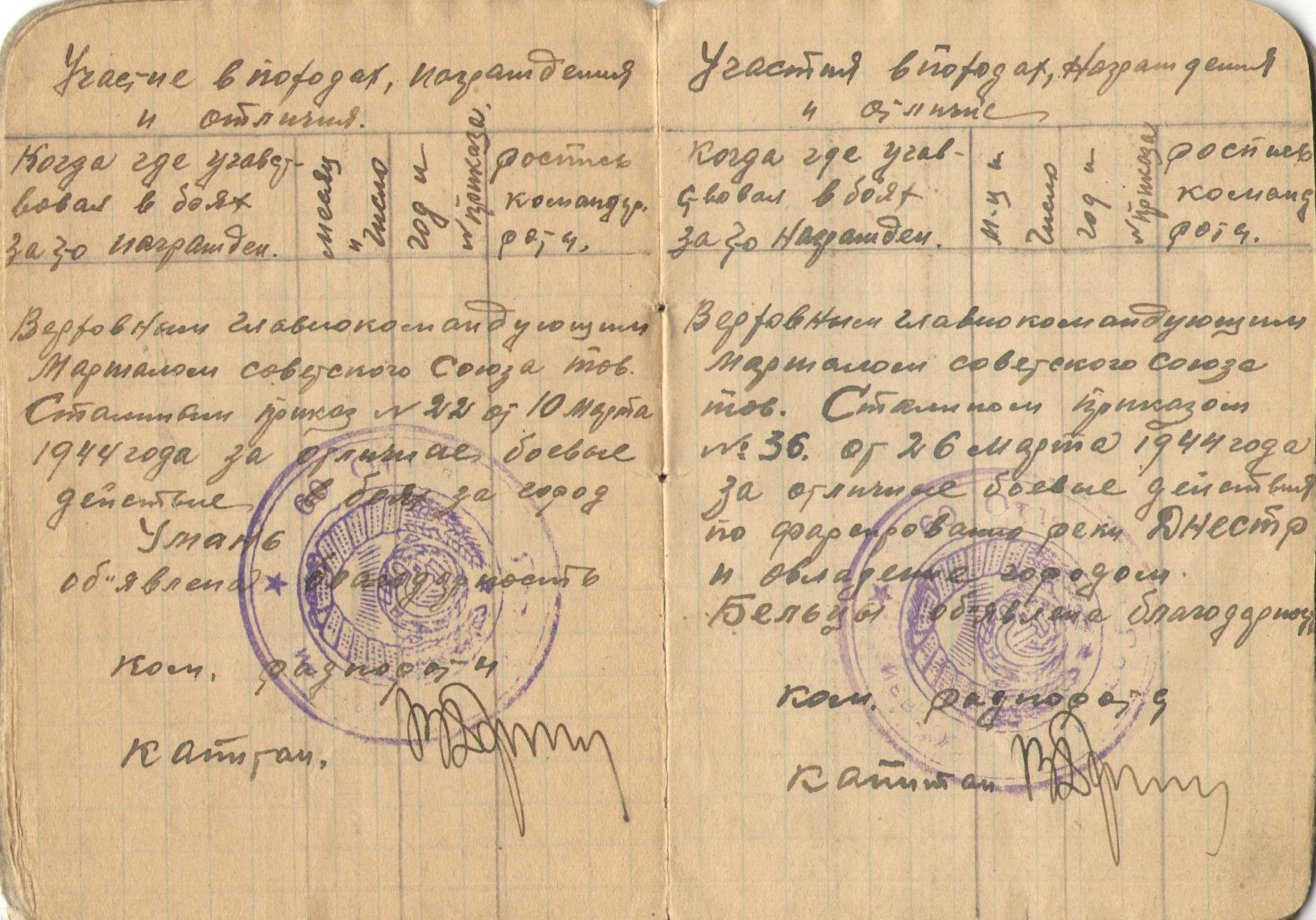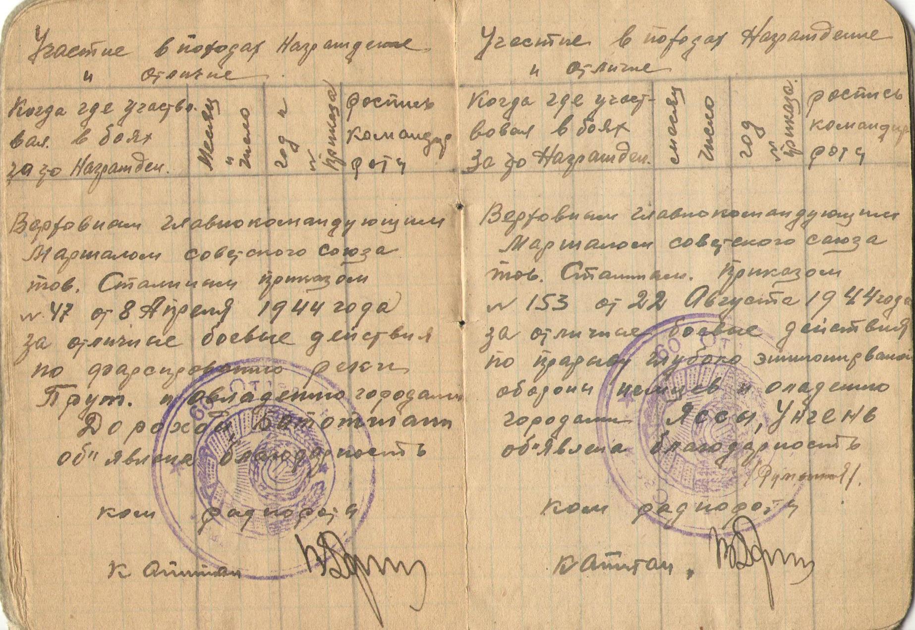 Благодарность в приказе № 47 от 8 апреля 1944 года за отличные боевые действия по форсирование реки Прут и овладению городами Дорохой и Ботошаны;