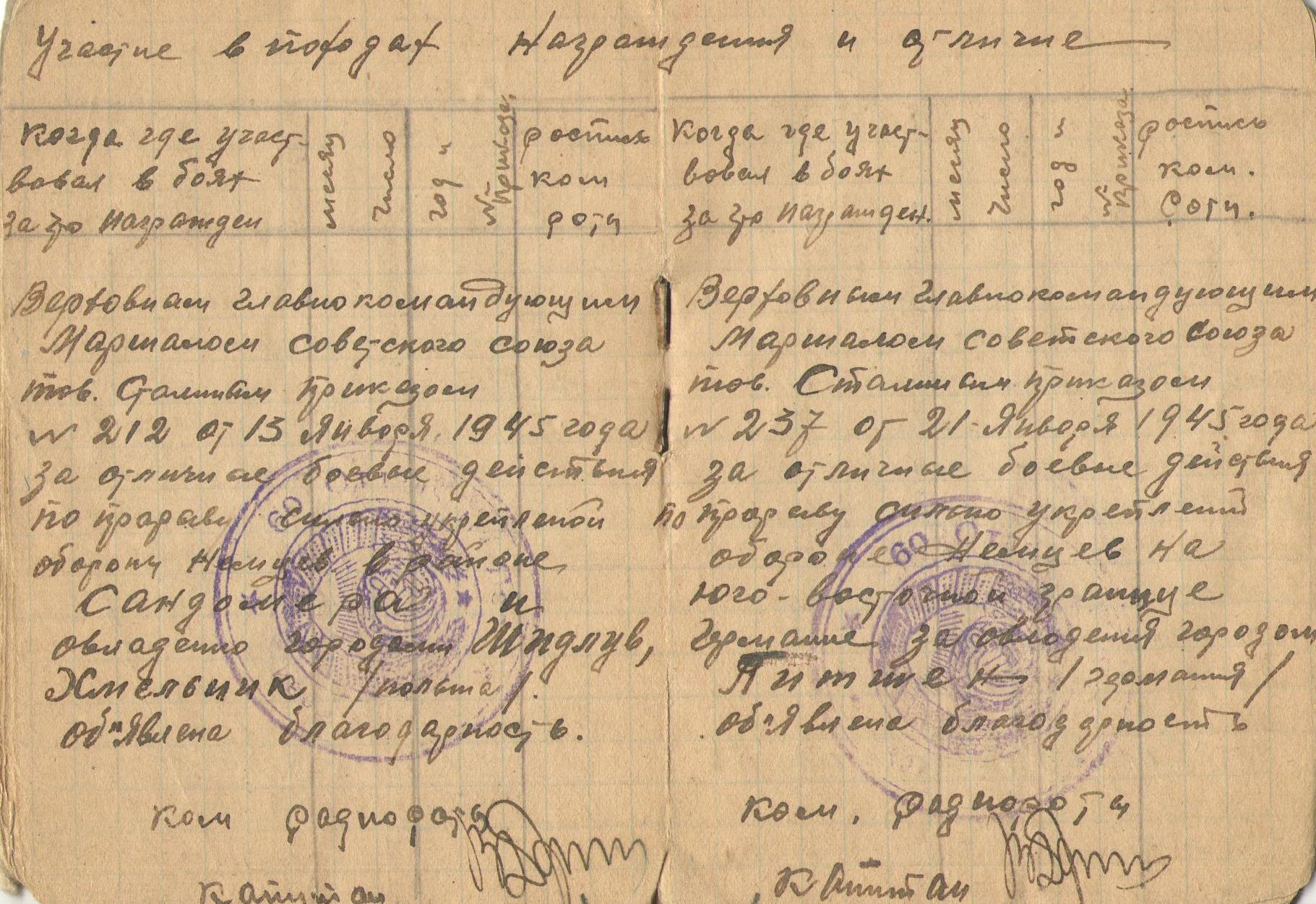 Благодарность в приказе № 212 от 13 января 1945 года за отличные боевые действия по прорыву сильно укрепленной обороны немцев в р-не Сандомира и овладении городами Шидлув, Хмельник (Польша);