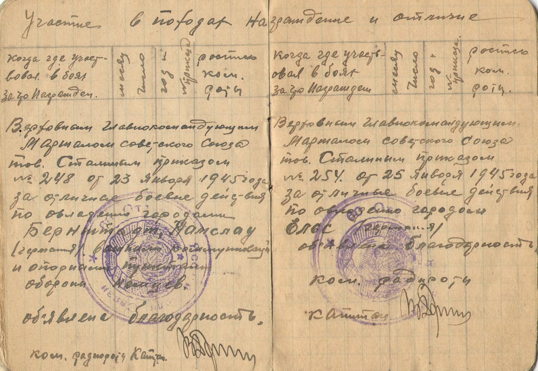 Благодарность в приказе № 248 от 23 января 1945 года за отличные боевые действия по овладению городами Бернштадт , Намслау;