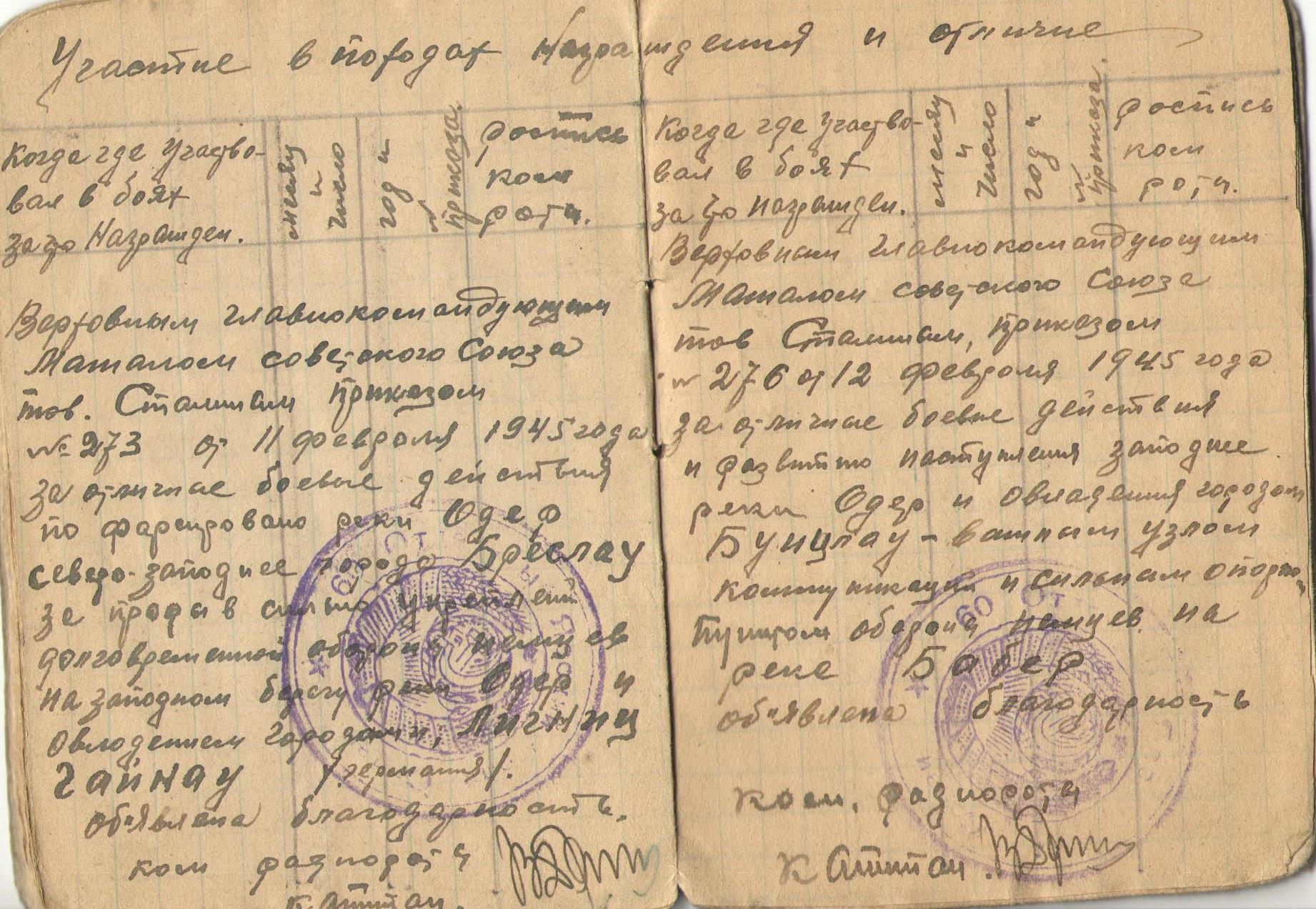 Благодарность в приказе № 276 от 12 февраля 1945 года за отличные боевые действия и развитию наступления западнее реки Одер и овладению городом Бунцлау – важным узлом коммуникаций и сильным опорным пунктом обороны немцев на реке Бобер.