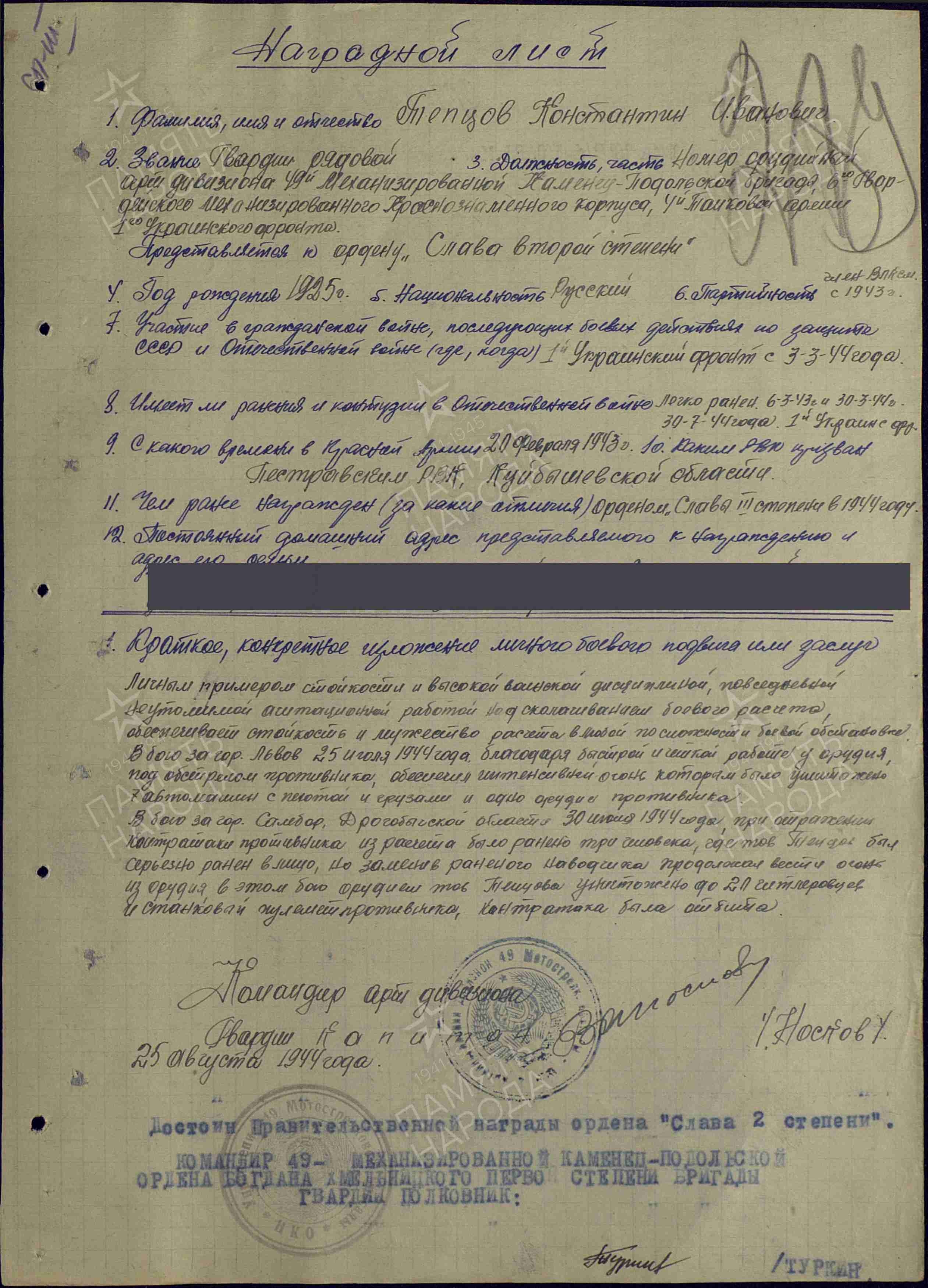 25 июля 1944 года в бою под городом Львов красноармеец Тепцов прямой наводкой вывел из строя вражеское орудие, 7 автомашин с пехотой. 30 июля у города Самбор при отражении контратаки противника был ранен, но продолжал вести огонь из орудия, уничтожил пулемет, свыше 10 противников. Приказом от 3 октября 1944 года за мужество, проявленное в боях с врагом, красноармеец Тепцов Константин Иванович награждён орденом Славы II степени.