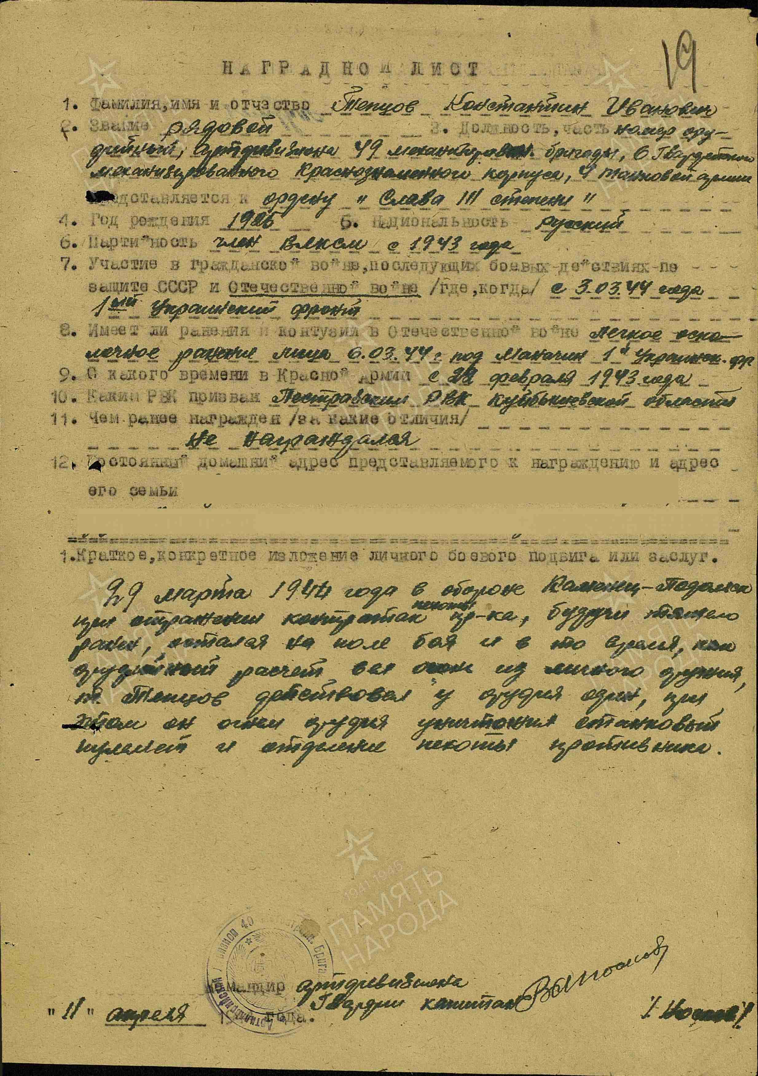 В боях Великой Отечественной войны с марта 1943 года. В составе бригады участвовал в Проскуровско-Черновицкой, Львовско-Сандомирской, Сандомирско-Силезской, Нижнесилезской, Верхнесилезской, Берлинской наступательных операциях. Воинское звание: младший сержант.