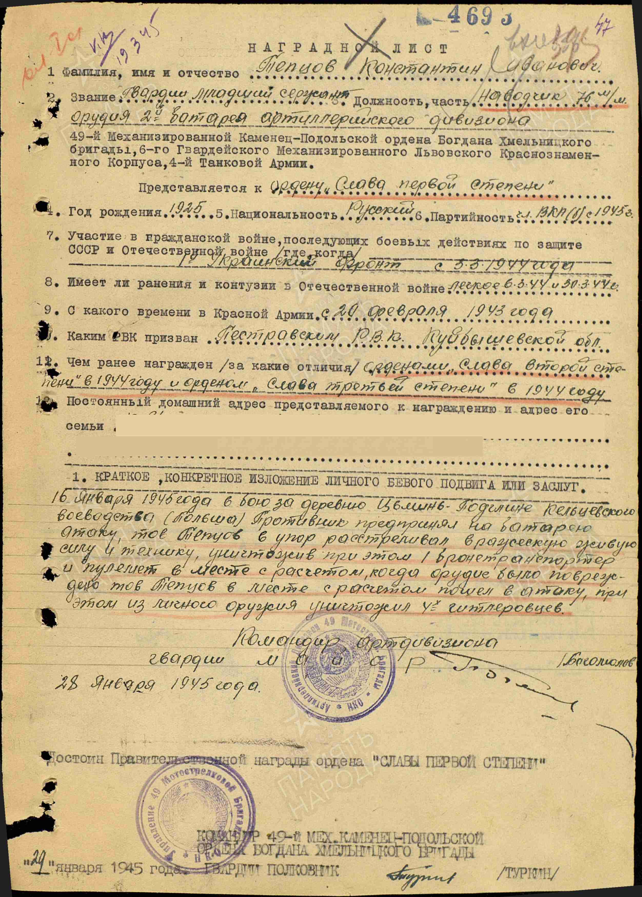 16 января 1945 года в бою у населенного пункта Цьмин-Подглине младший сержант Тепцов, командуя расчетом, огнём из орудия поразил вражеский бронетранспортер и пулемет с расчетом. Затем поднял бойцов в атаку, сразил ещё несколько противников. 17 марта 1945 года 49-я мехбригада стала 35-й гвардейской механизированной бригадой. Указом Президиума Верховного Совета СССР от 10 апреля 1945 года за мужество, отвагу и героизм, проявленные в борьбе с захватчиками, гвардии младший сержант Тепцов Константин Иванович награждён орденом Славы I степени.