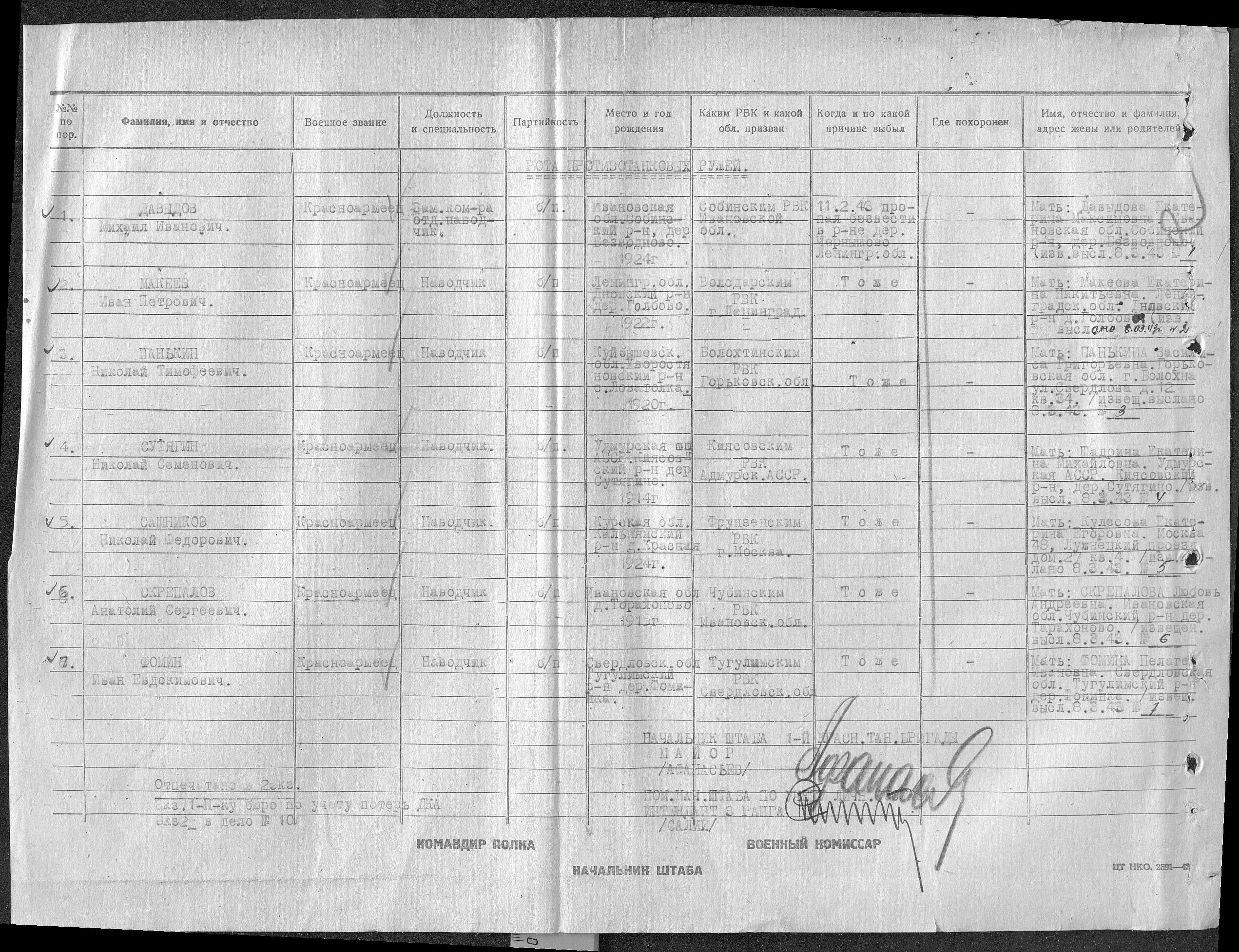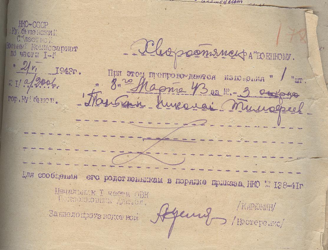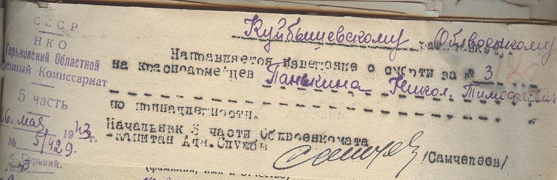 Николай родился в 1920 году. Из архивных документов Минобороны известно только, что его последнее место службы 1 танковая бригада. Красноармеец Николай Панькин пропал без вести 11 февраля 1943 года в районе деревни Чернышево Ленинградской области. Другой информации на сегодняшний день нет.