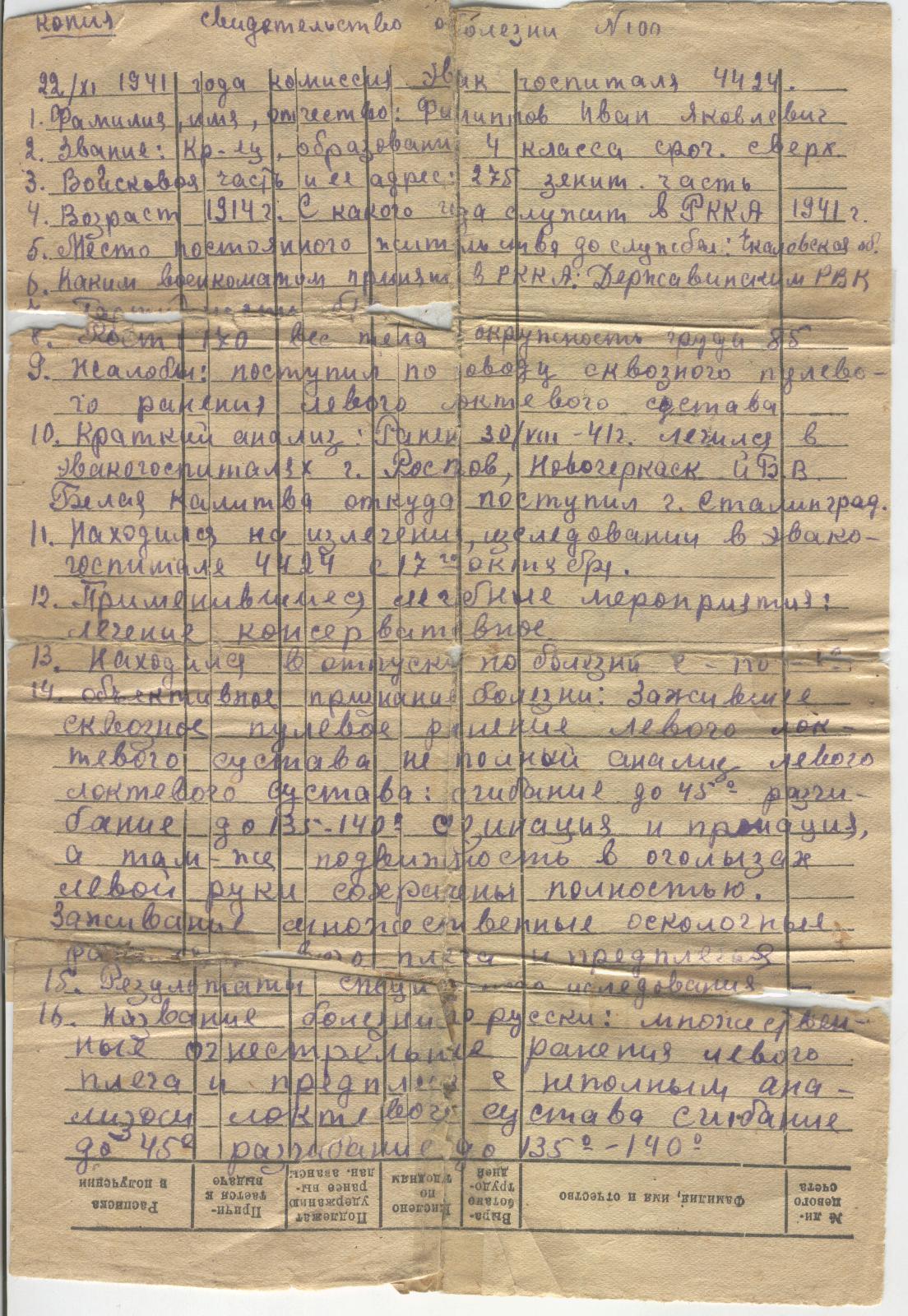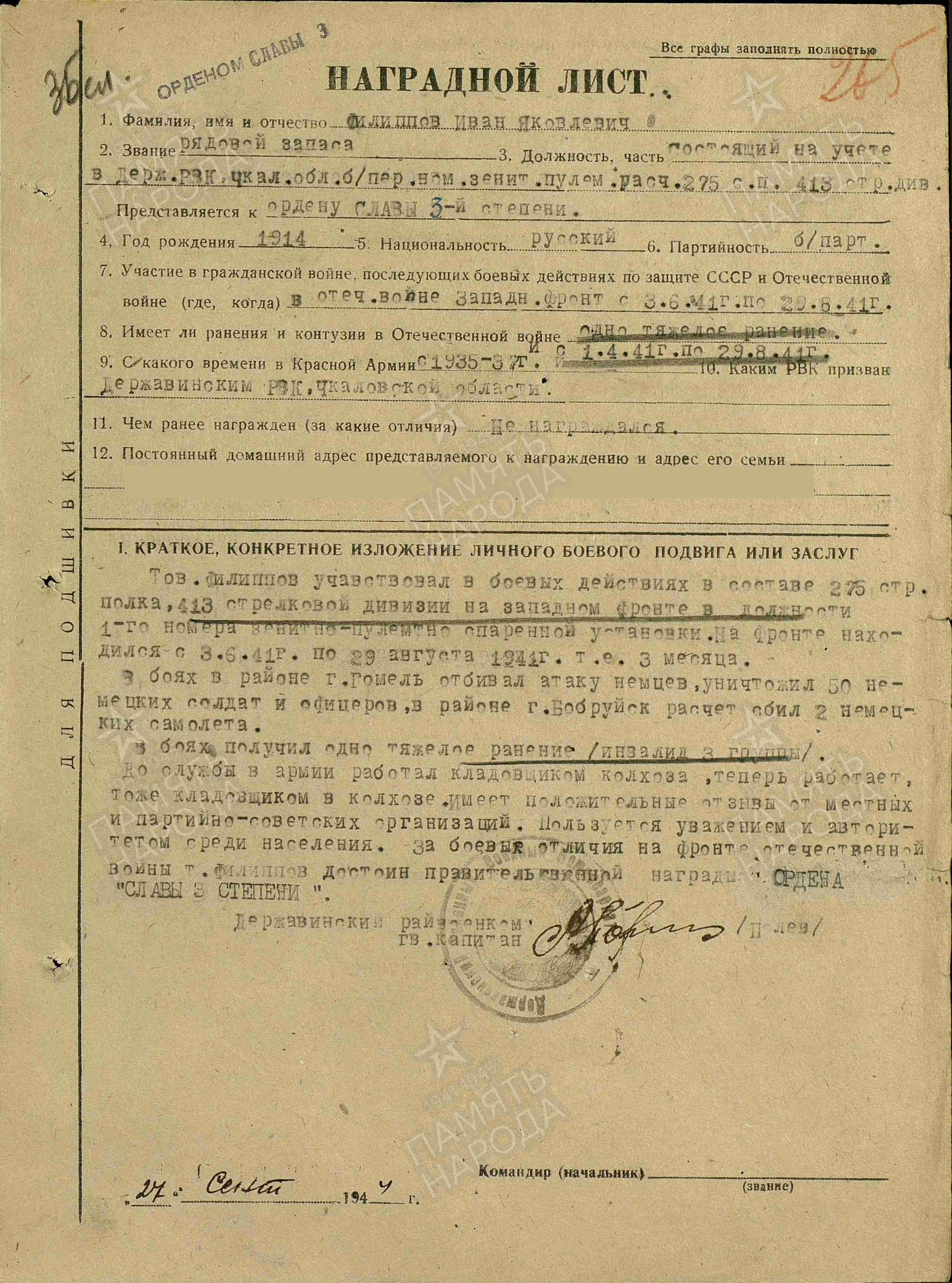 Филиппов Иван Яковлевич родился в 1914 г. в деревне Екатериновка Бузулукского уезда Самарской губернии (ныне Оренбургской области). До войны работал кладовщиком колхоза. Был призван в РККА 1 апреля 1941 г. Служил в 275-м стрелковом полку в должности 1-го номера спаренной зенитной пулеметной установки. В ходе боев в районе г. Гомеля, отбивая атаку немцев, уничтожил 50 немецких солдат и офицеров. В районе г. Бобруйска расчет Филиппова сбил 2 немецких самолета. 20 августа 1941 г. Иван Яковлевич был тяжело ранен. В ноябре 1941 г. его уволили с военной службы по ранению. Филиппов был награжден орденом Славы III степени. После армии Иван Яковлевич снова работал кладовщиком в колхозе. Скончался он 23 августа 2000 г.