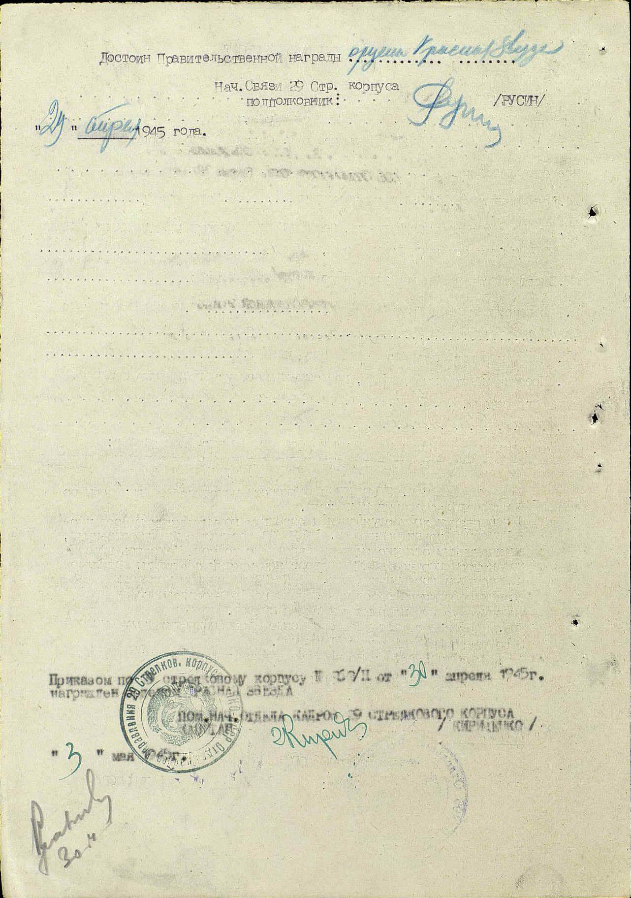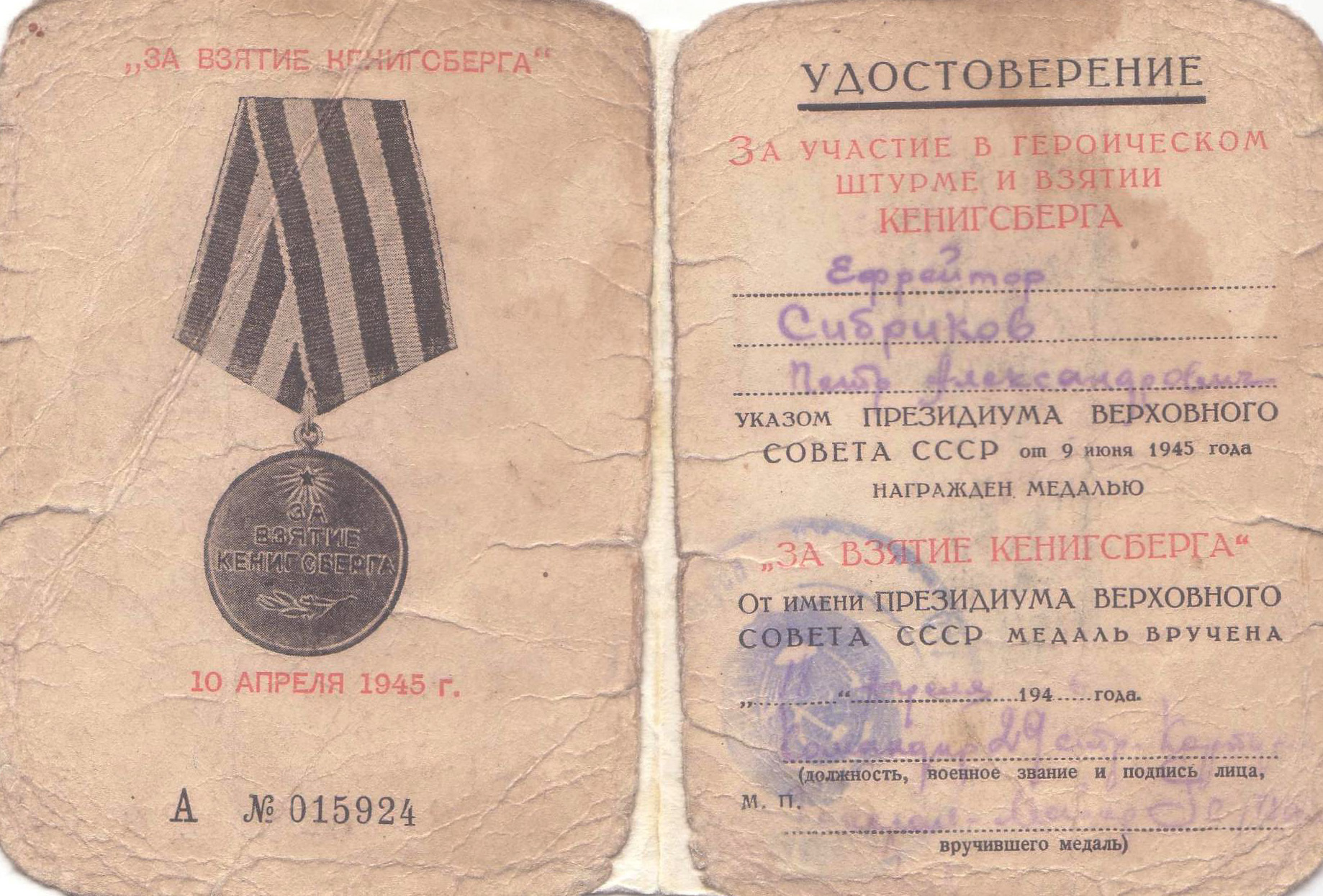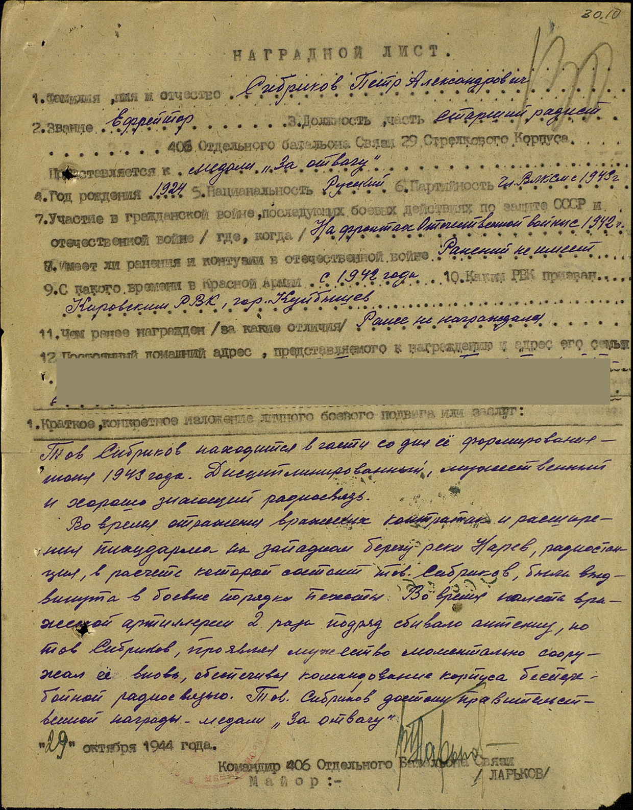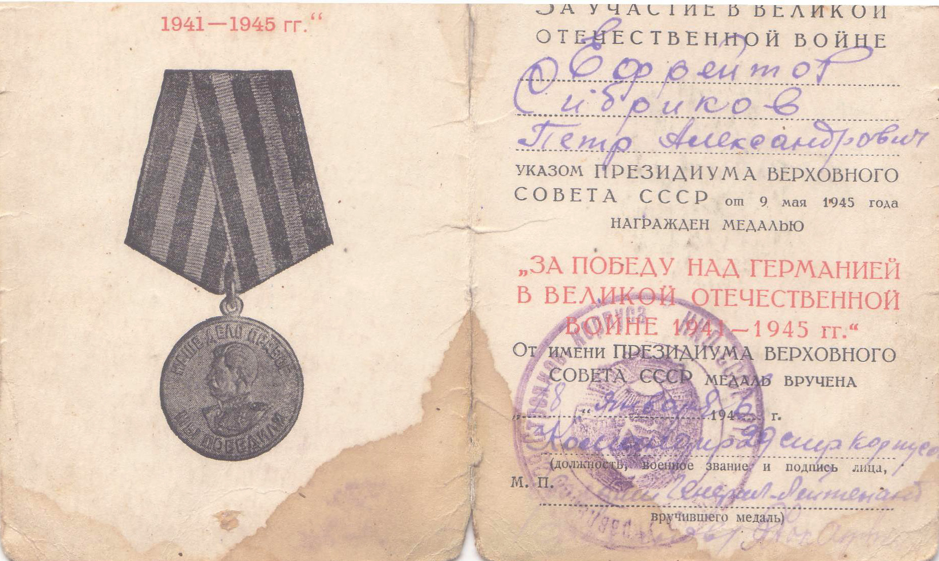 Сибриков Петр Александрович родился в 1925 году. В армию был призван по разным документам в 1942 – 1943 годах Кировским РВК города Куйбышева. С июня 1943 года ефрейтор Сибриков П.А. находился в действующей армии и служил радистом в 406-ом Отдельном батальоне связи 29 стрелкового корпуса 48 армии.