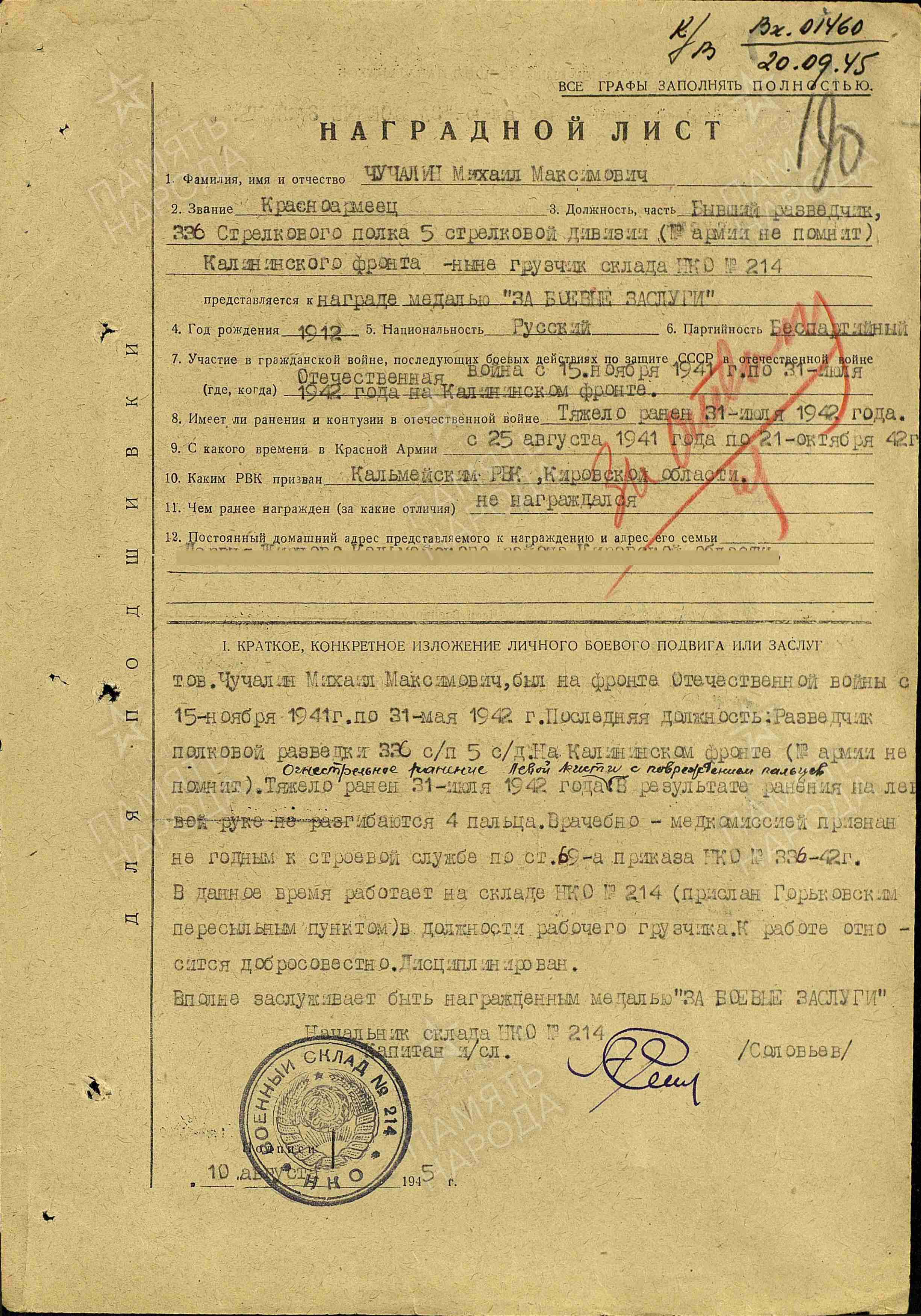 Чучалин Михаил Максимович родился 6 сентября 1912 года в с. Жирново Вятской губернии (ныне Кировской области). До 1941 года работал в полеводческом стане бригадиром. В первые дни Великой Отечественной войны был призван в ряды Советской армии. Находился на фронте с 15-го ноября 1941 года по 31 мая 1942 года. Служил разведчиком полковой разведки 336-го стрелкового полка 5 стрелковой дивизии, на Калининском фронте. 31 июля 1942 года был тяжело ранен: огнестрельное ранение левой кисти с повреждением пальцев. В результате ранения на левой руке не сгибаются четыре пальца. Врачебной медкомиссией Чучалин был признан не годным к строевой службе по ст. 69-а приказа НКО № 336 1942 года. После работал на складе НКО № 214 в должности рабочего грузчика. В начале 1946 года Михаил Максимович вернулся домой.