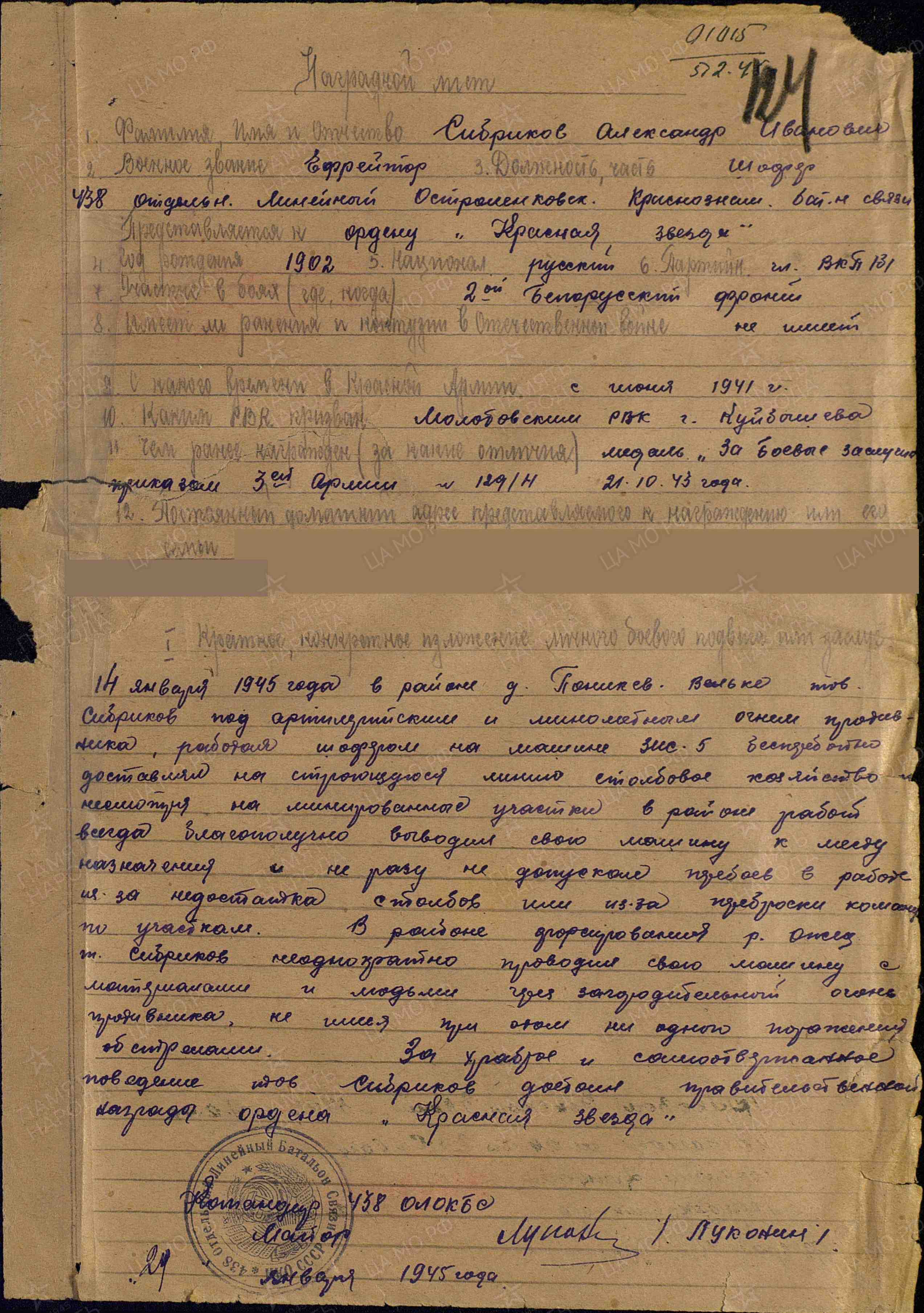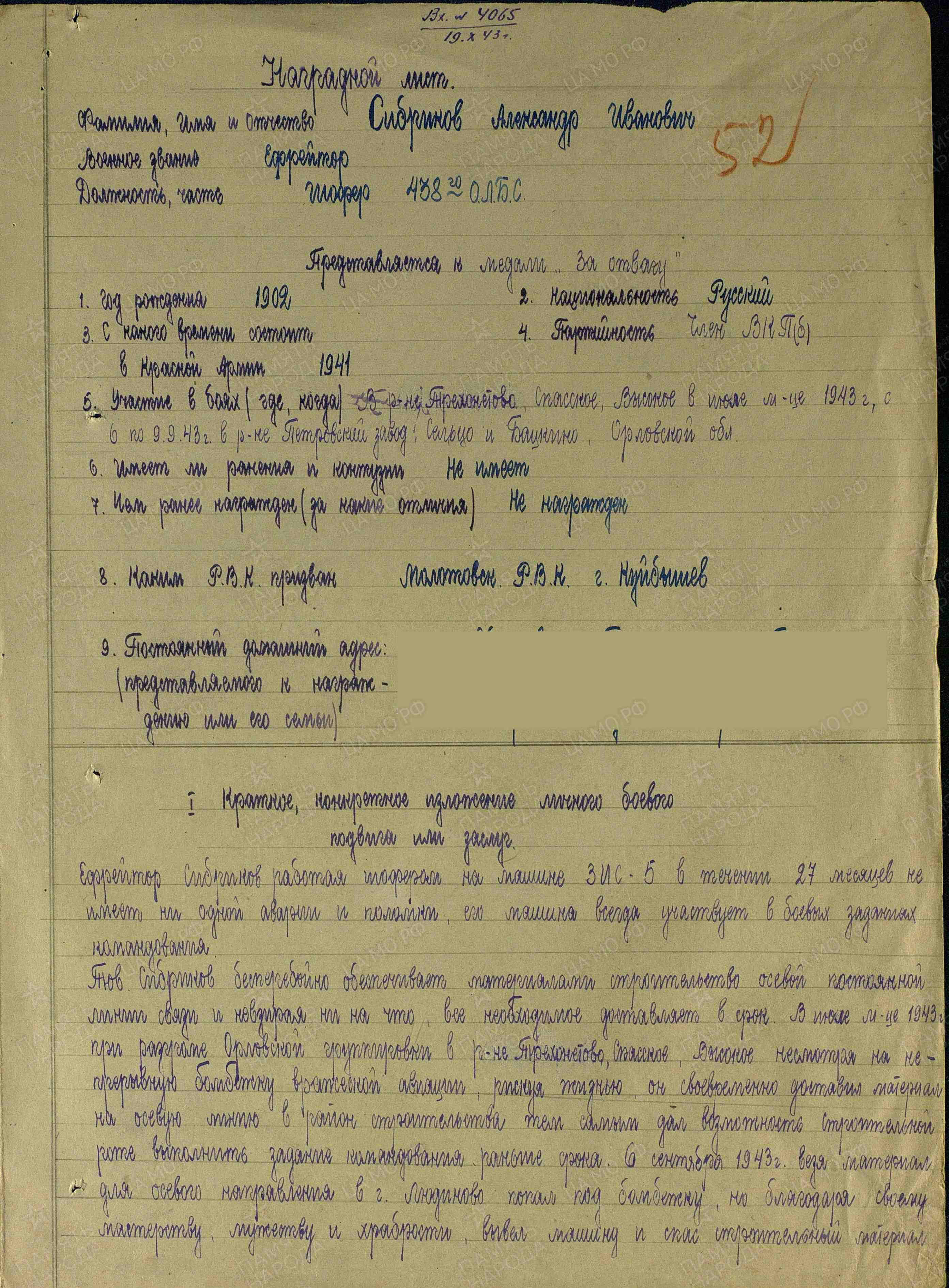 Ефрейтор Сибриков, работая шофером на машине ЗИС-5 в течение 27 месяцев, не имеет ни одной аварии и поломки, его машина всегда участвует в боевых заданиях командования. Тов. Сибриков бесперебойно обеспечивает материалами строительство осевой постоянной линии связи и, невзирая ни на что, все необходимое доставляет в срок. В июле 1943 г. при разгроме Орловской группировки в районе Трехонетово, Спасское, Высокое, несмотря на непрерывную бомбежку вражеской авиации, рискуя жизнью, своевременно доставил материал на осевую линию в район строительства, тем самым дал возможность строительной роте выполнить задание командования раньше срока. 6 сентября 1943 г., везя материал для осевого направления в г. Людиново, попал под бомбежку, но, благодаря своему мастерству, мужеству и храбрости, вывел машину и спас строительный материал, доставив его вовремя. С 6 по 9 сентября 1943 г., работая в районе населенных пунктов Петровский завод, Сельцо и Бацкино, попал под артиллерийский и минометный огонь противника. Умело вывел машину из-под огня, оказал раненому бойцу помощь и доставил груз вовремя, тем самым обеспечил своевременность постройки осевой постоянной линии. Тов. Сибриков в боях за Родину показал себя храбрым и мужественным бойцом, стойким коммунистом. Достоин правительственной награды – медали «За отвагу» (награжден медалью «За боевые заслуги»; наградной лист от 8.10.1943 г.).