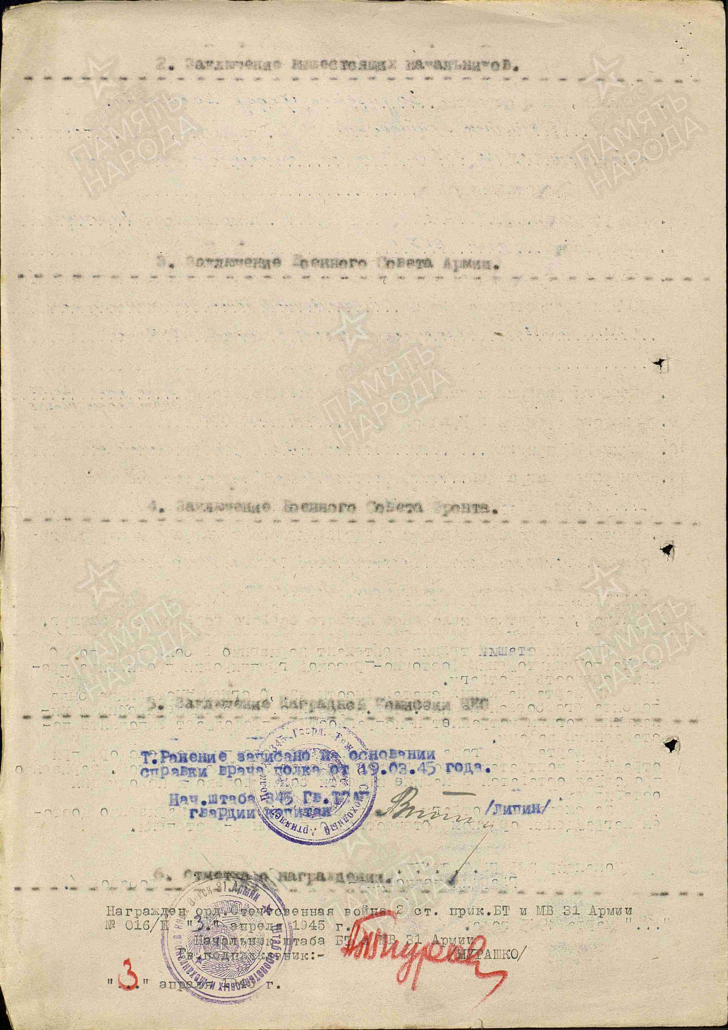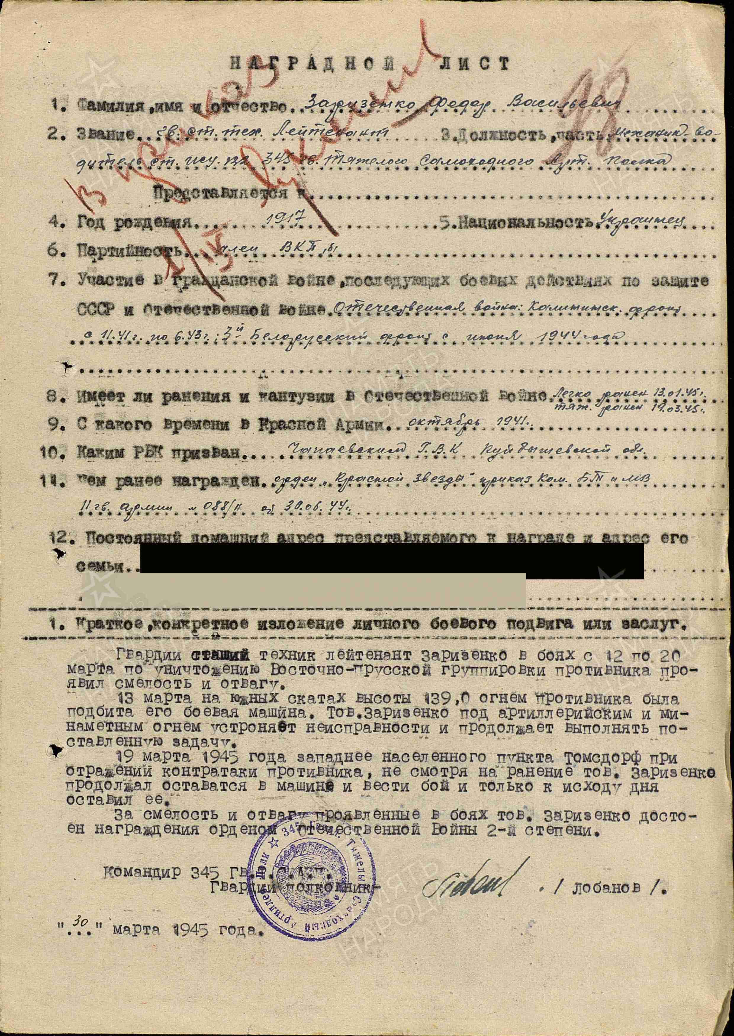 Из наградного листа к ордену Отечественной войны II степени от 30 марта 1945 года: