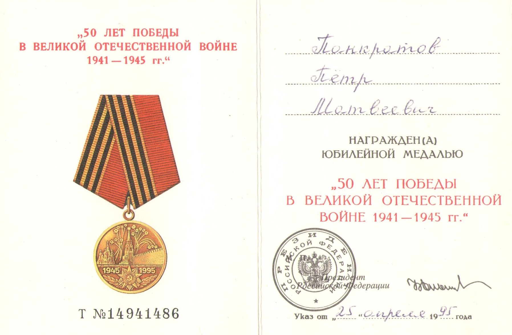 - Юбилейная медаль «50 лет Победы в Великой Отечественной войне 1941—1945 гг.»;