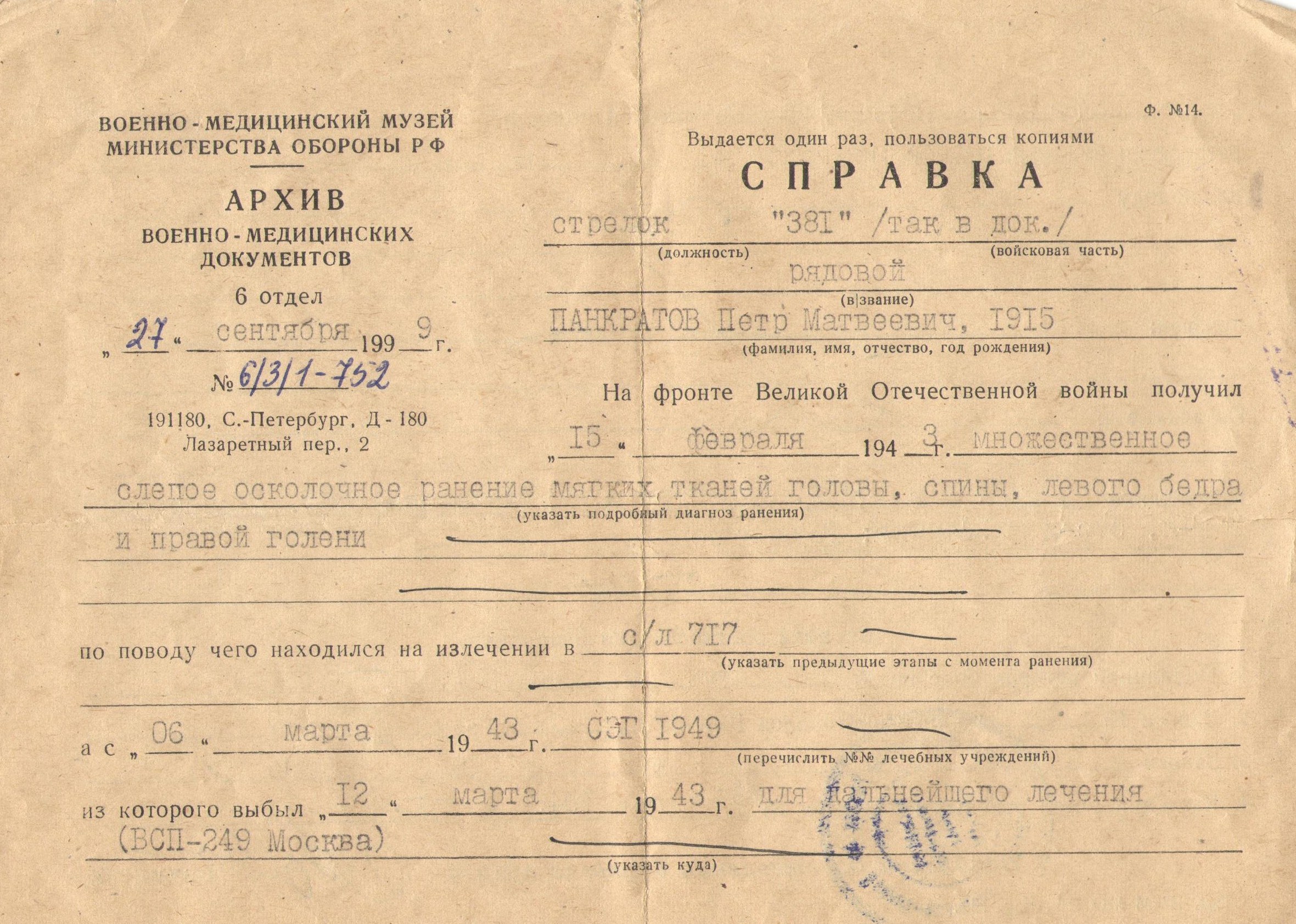 Петр Матвеевич Панкратов родился в 1915 г. Проходил службу в звании рядового в 387 артиллерийском полку, 1 артиллерийской дивизии на 1-ом Украинском фронте. 15 февраля 1943 г. во время боев он получил ранение. После войны Петр Панкратов работал трактористом в совхозе им. Ленина, отд. №3. Умер 19 октября 2003 года. Похоронен на кладбище п. Бутковский Красноармейского района Самарской области.