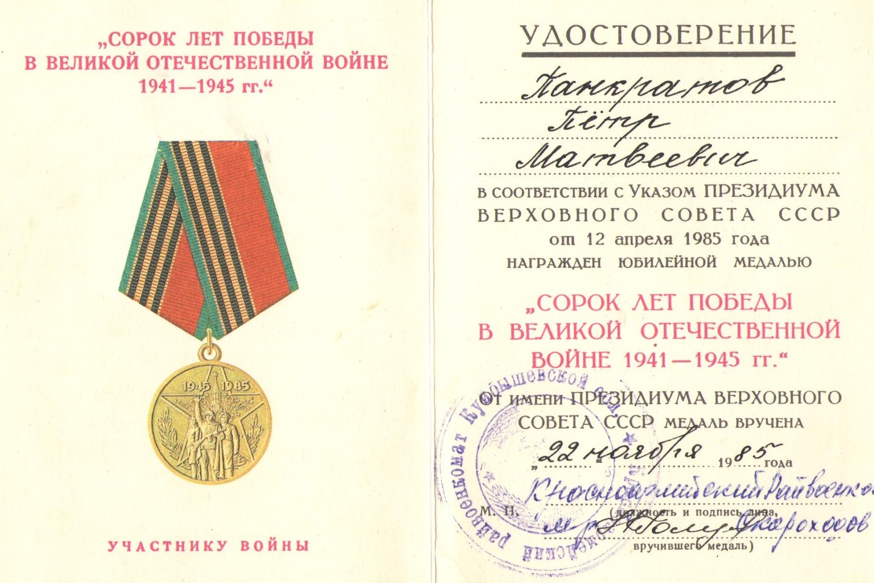 - Юбилейная медаль «Сорок лет Победы в Великой Отечественной войне 1941—1945 гг.»;
