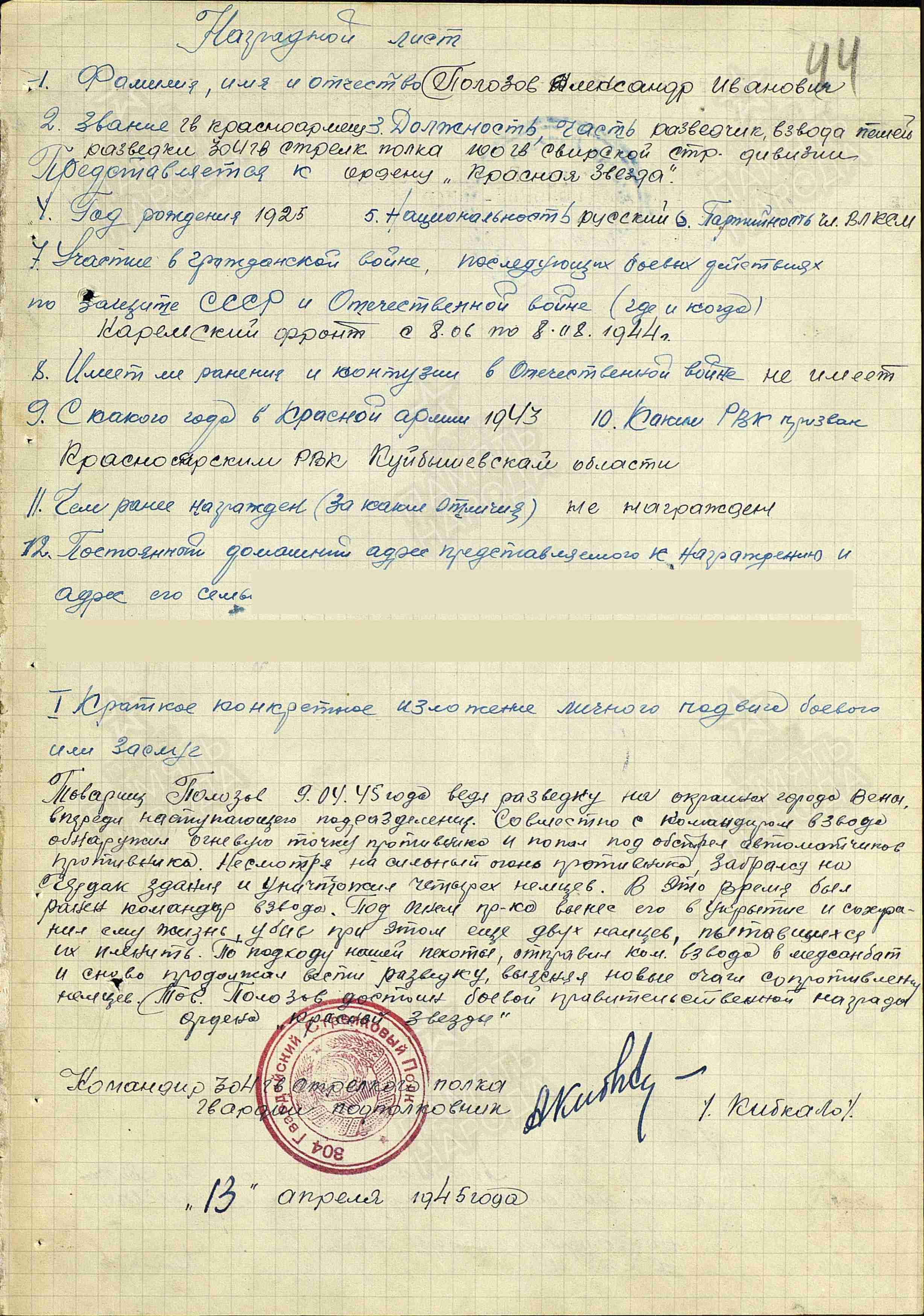 Александр Иванович Полозов родился 23 октября 1925 года в селе Красный Яр Самарской области. Экстерном закончил 10 классов Красноярской школы и зимой 1943 года вместе со сверстниками ушел на фронт. Он вспоминал, что парни тогда стремились на передовую. Зима в тот год выдалась суровой. Холод, пурга, а их везут на санях до Самары. Провожали близкие, одноклассницы, любимая девушка Валя Долматова. Плакали, бежали за поездом, молились о благополучном возвращении.