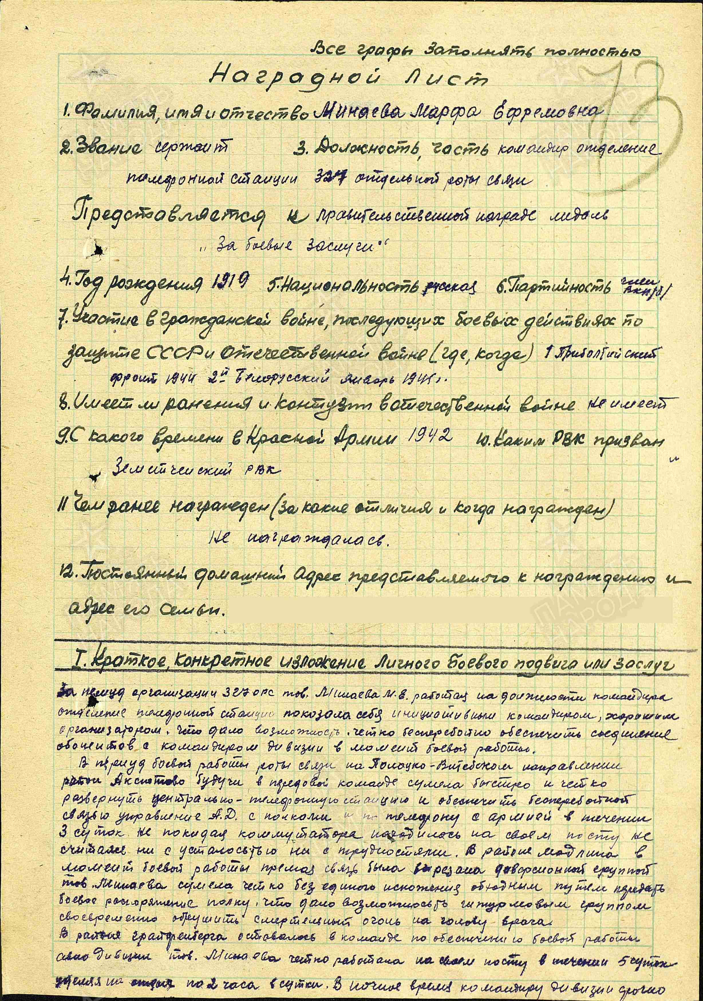 Из 17 детей семьи Минаевых на войну ушли пятеро: три брата и две сестры. Братья погибли. В 1942 году Марфе было 23 года, когда пришла повестка на фронт.