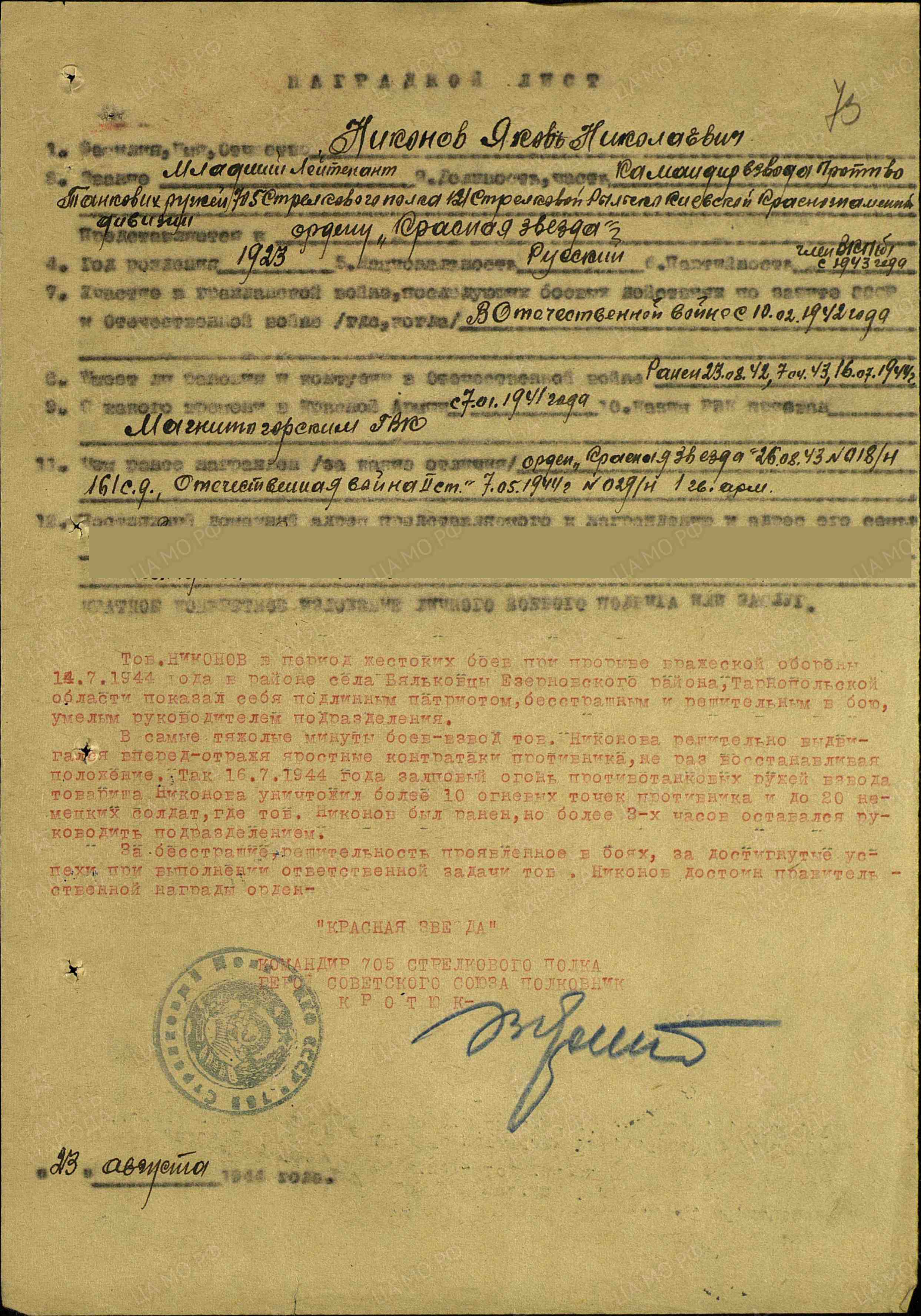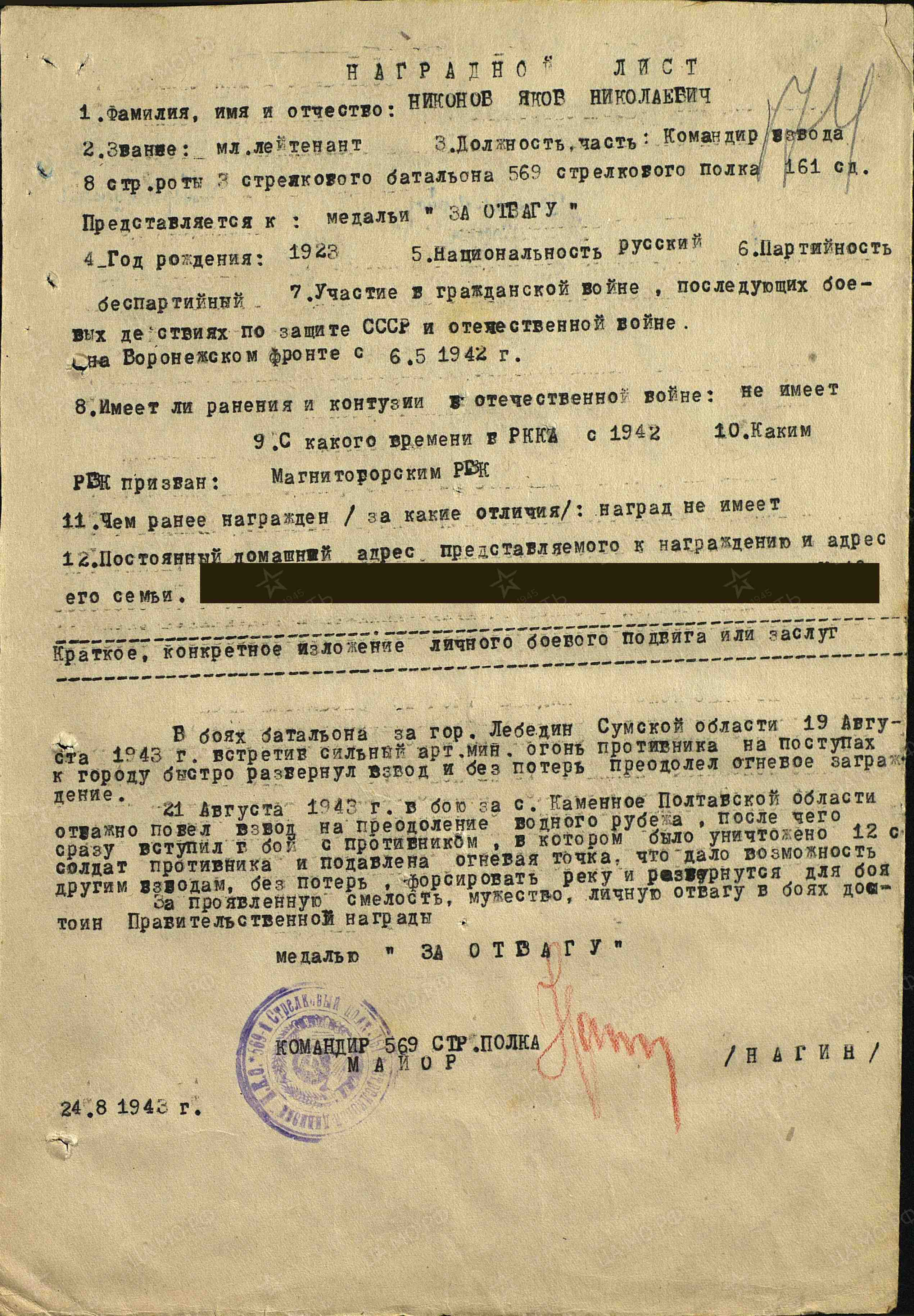 Я хотел бы рассказать о моем прадеде Никонове Якове Николаевиче. Он родился 1923 году в с. Васильевке. Закончив школу-семилетку, уехал в Магнитогорск, где работал и учился на летных курсах ОСВИАХИМ. Закончил курсы в 1941 году. Началась война, но будущему летчику было только семнадцать! Друзья, с которыми он учился, были старше, из их числа был сформирован авиаполк, а он остался (не дотянул годами). Два брата Якова уже ушли на фронт, и он не стал отсиживаться дома. Пришел в военкомат и записался добровольцем. За годы войны дед от рядового солдата вырос до старшего лейтенанта. Командовал взводом пешей полковой разведки, восемнадцать раз ходил за «языком» за линию фронта, четыре раза был ранен, из них два – тяжело. На груди у Якова Николаевича два ордена Красной Звезды и два ордена Отечественной войны, много медалей.