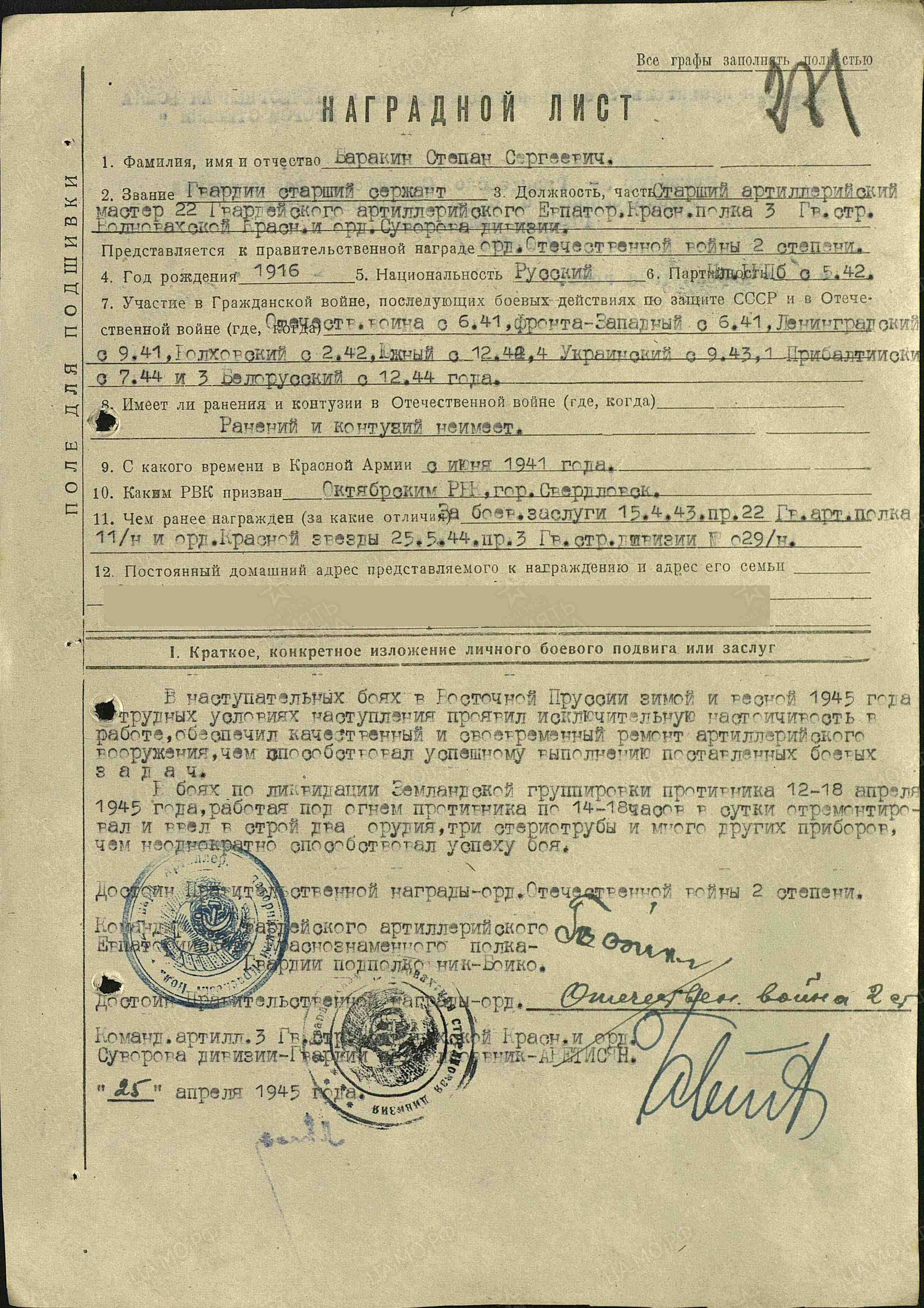Ольга и Татьяна Баракины из Сергиевска рассказали о своем прадеде, участнике Великой Отечественной войны Степане Сергеевиче Баракине. Степан Сергеевич родился в Сергиевске в простой крестьянской семье в 1916 году. В 6 лет лишился отца. Его мама Анастасия Петровна осталась с четверыми детьми на руках. Степан тогда был самым младшим. Детство его было тяжелым и трудным, как и у всех ребятишек того времени. Когда началась проклятая война, прадедушку и его брата Павла призвали в армию. Павел погиб в одном из боев, а Степан вернулся домой. Он проходил военную службу в действующей армии в составе 22-го гвардейского артиллерийского полка 3-й гвардейской стрелковой дивизии с сентября 1941 года по май 1945-го, но демобилизован был только 20 марта 1946-го.