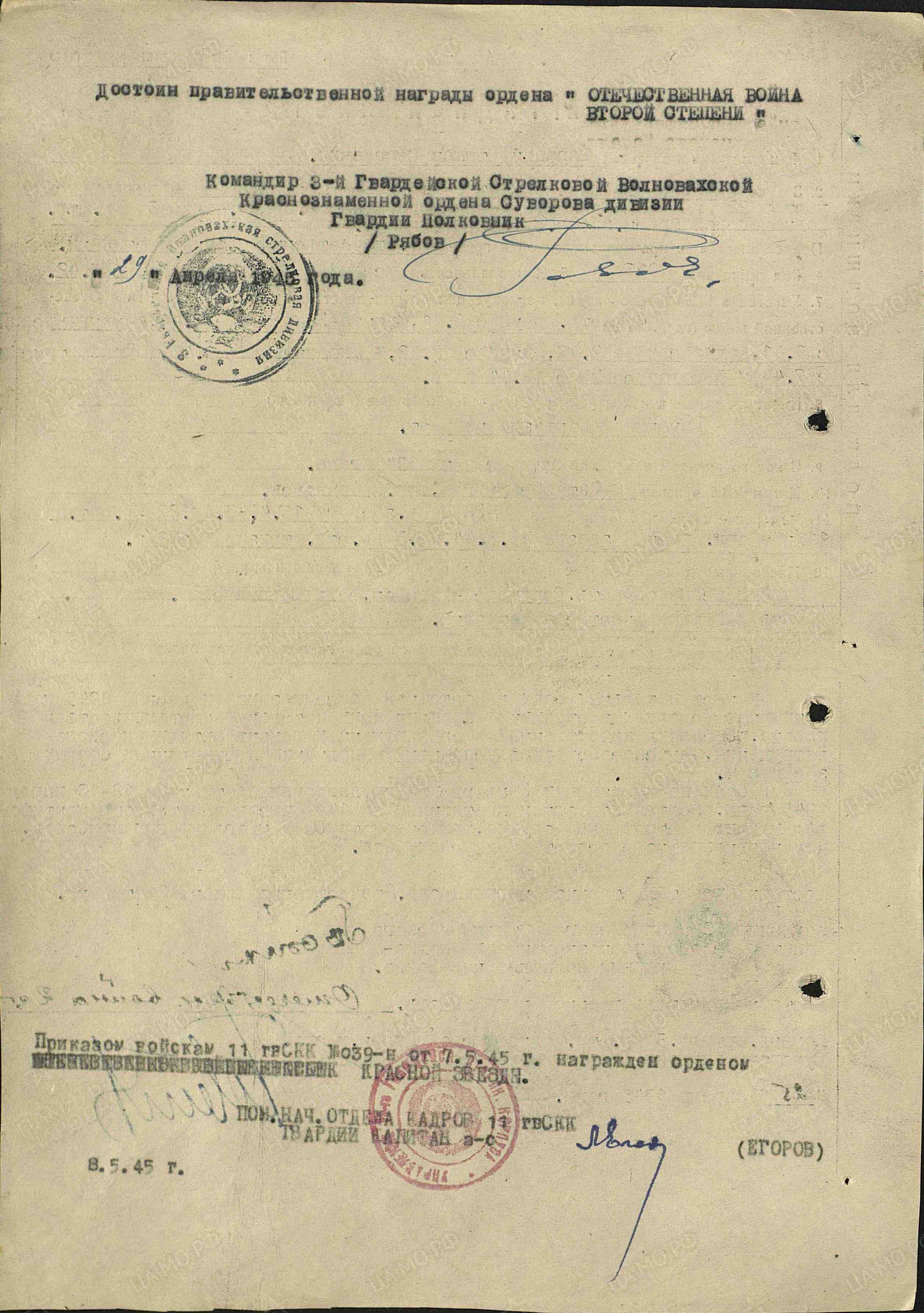 Прадедушка самоотверженно сражался против фашистских захватчиков за честь и независимость нашей Родины в звании гвардии старшего сержанта и должности старшего оружейного мастера. Он воевал на рубежах Днепра, защищал Ленинград, громил немцев под Сталинградом, освобождал легендарный город русской славы Севастополь, штурмовал Кенигсберг, Белоруссию, Украину и Польшу. День Победы встретил в Чехословакии. Возможно, что в рядах Красной Армии он освобождал и нашего другого прадедушку – Шамина Ивана Федоровича из плена 10 мая 1945 г. Именно эта дата стоит на фронтовой фотографии прадедушки Степана в Чехии.