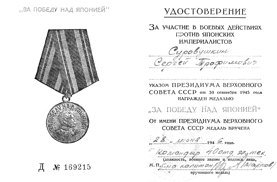 Суровушкин С.Т. родился в селе Владимировка Хворостянского района Куйбышевской области. Награжден медалью «За победу над Японией». Умер Сергей Трофимович в 2008 году. Другой информации нет.