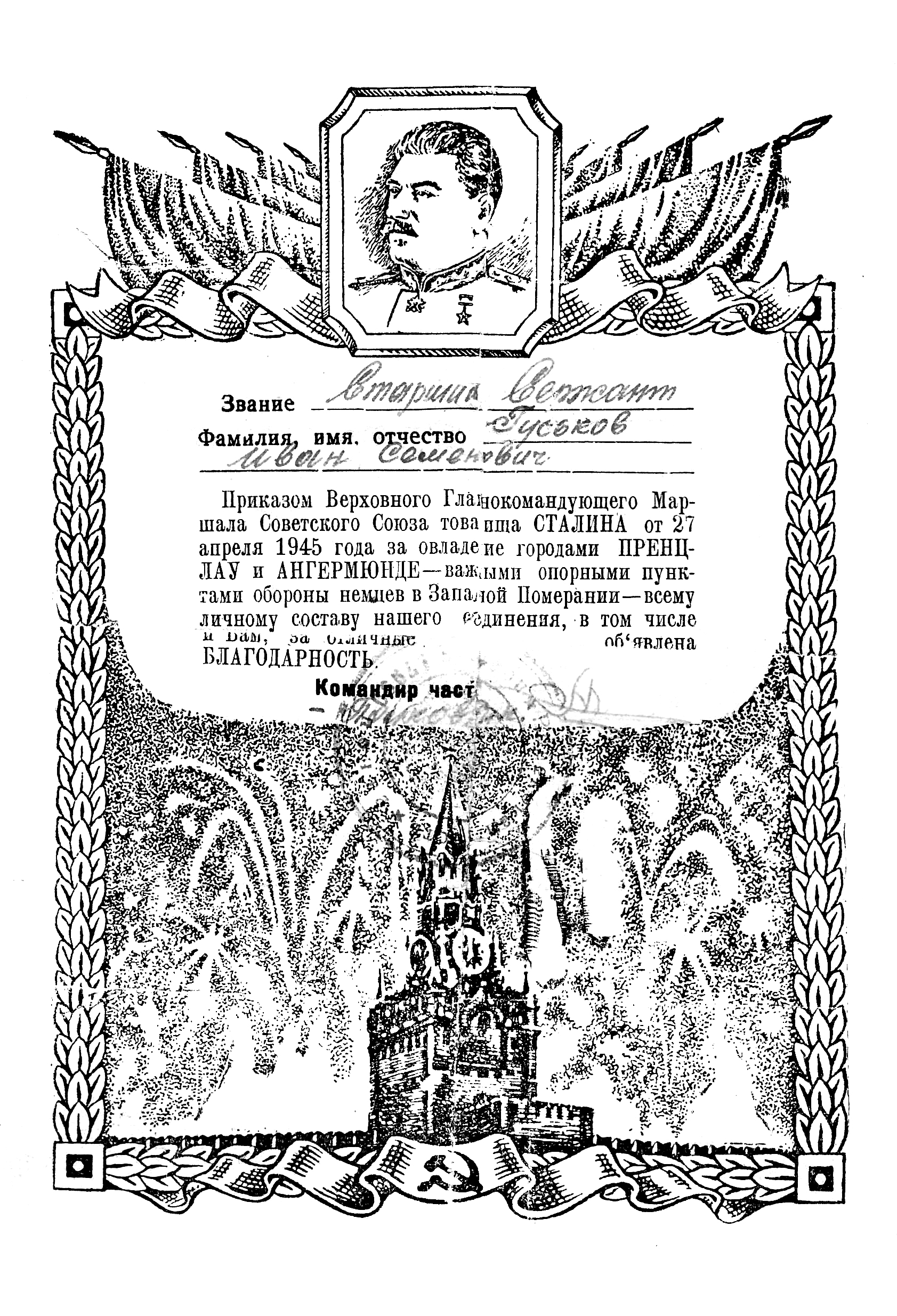 Гуськов Иван Семёнович родился в селе Елань Хворостянского района Куйбышевской области в 1918 году, умер 9 января 1998 года. Красноармеец, призван в РККА с 1939 года. Служил разведчиком – парашютистом 188-го стрелкового полка 106-й Забайкальской дивизии. На фронт попал в феврале 1943 года. Воевал на Центральном фронте.