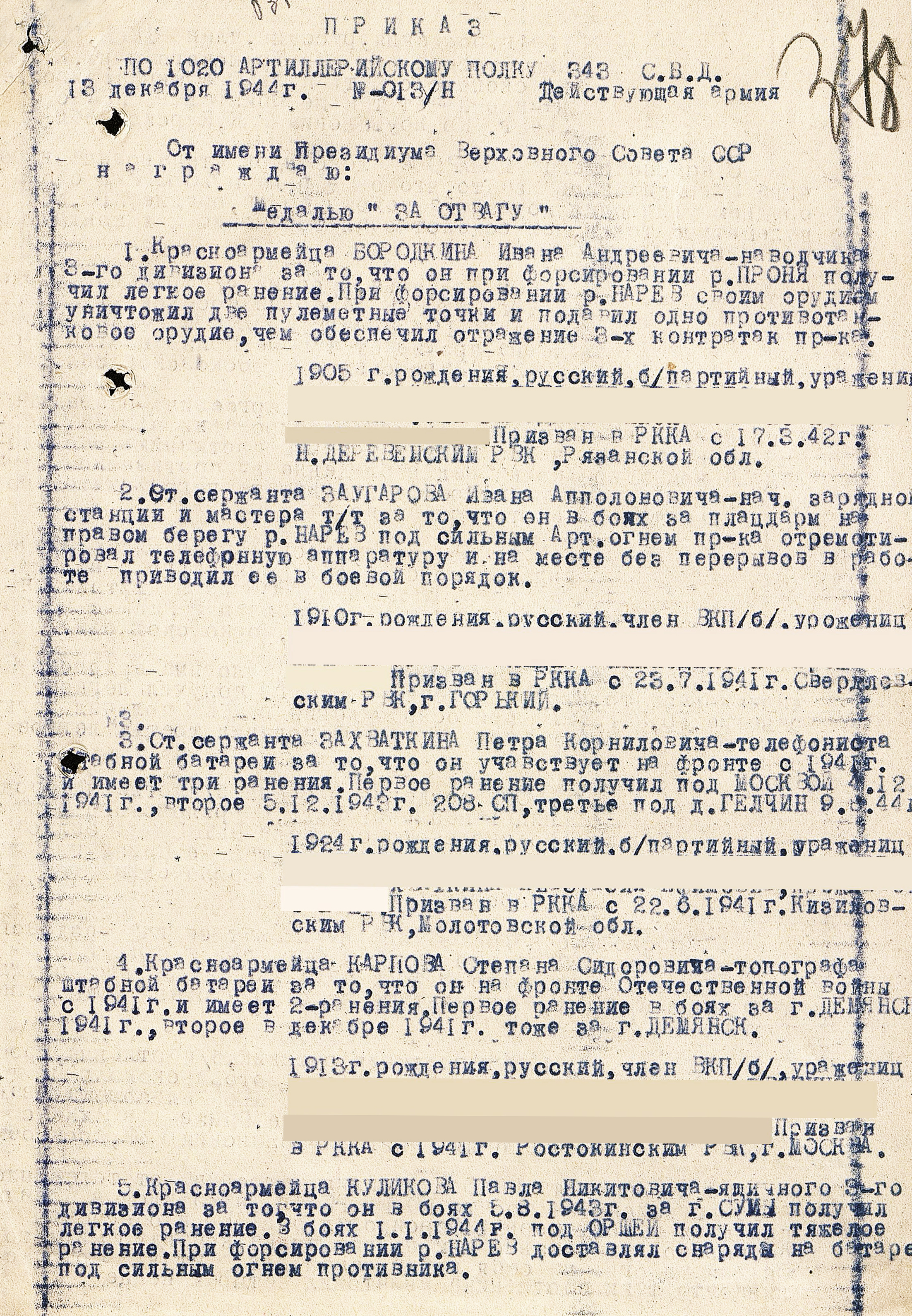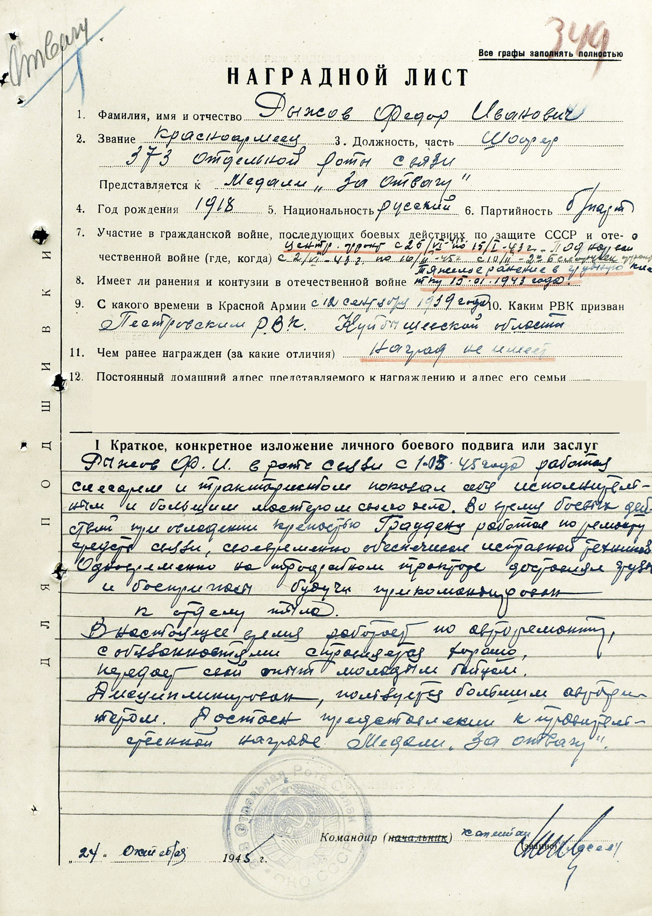 Рыжов Фёдор Иванович был призван в армию в 1939 году Пестравским РВК на Дальний Восток (7 км. от Японской границы). В 1941 году должен был вернуться домой, но началась война с Германией. Служил в автороте, пехоте. Дошёл до Берлина. Освобождал Кенигсберг, был награждён медалью «За взятие Кенигсберга». В 1943 году в городе Витебске получил ранение в грудь. «Ещё одно ранение – в голову, где его получил уже не помню, но память об этом ранении до сих пор у меня в голове…..», «Брали Мазурские острова … штурмом, трое суток, за что Сталин объявил благодарность» (из прижизненных воспоминаний Рыжова Ф.И.) Награды: 2 медали «За отвагу»; медаль «За взятие Кенигсберга»; «За Победу над Германией в Великой Отечественной войне 1941–1945 гг.»; Орден Отечественной войны II степени. После войны ещё год помогал наводить порядок в Германии. Домой демобилизовался в 1946 году. Умер Ф.И. Рыжов в 2001 году, похоронен на кладбище с. Новокуровка.