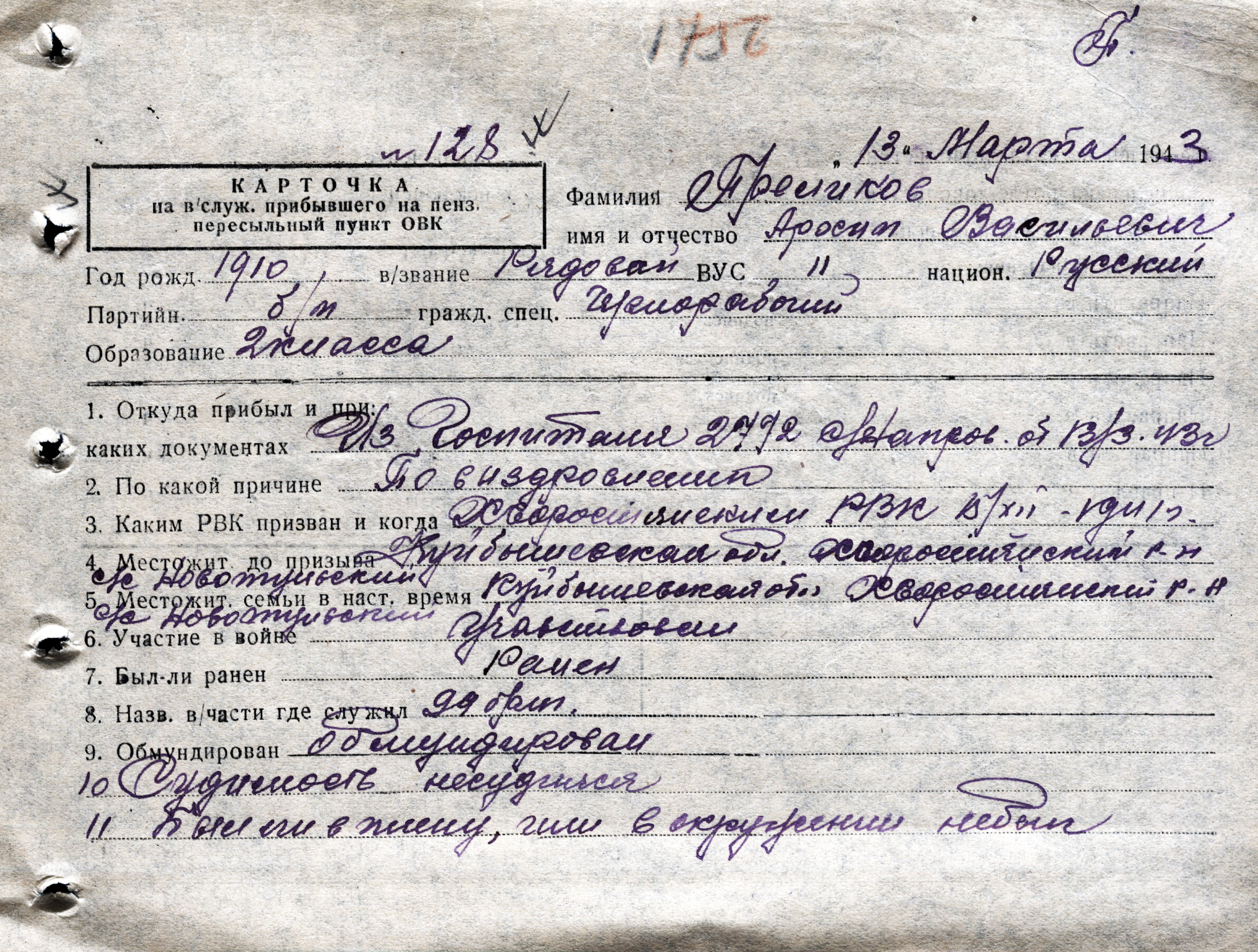 Преликов Архип Васильевич был призван в ряды РККА Хворостянским РВК. Служил рядовым солдатом. Известно, что в Ростовской области в Сальском районе 20 января 1943 года пропал без вести. Из документов ясно, что был ранен, а 4 января 1944 года был убит, Похоронен в селе Малое Радзивиловка Житомирской области. Другой информации нет.