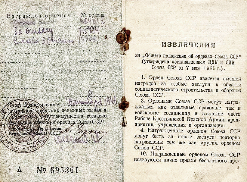 В бою за д. Шандра 4 октября 1944 г. в составе разведгруппы зашел в тыл противника, выявил расположение его артиллерийско-минометных батарей. При возвращении, когда на них напала группа вражеских автоматчиков, рискуя жизнью, спас своего командира взвода от угрожавшей ему опасности. Подоспев на помощь командиру взвода, трех немцев застрелил из автомата, а одного зарезал ножом. Достоин правительственной награды – ордена Славы III степени (наградной лист от 20.10.1944 г.).