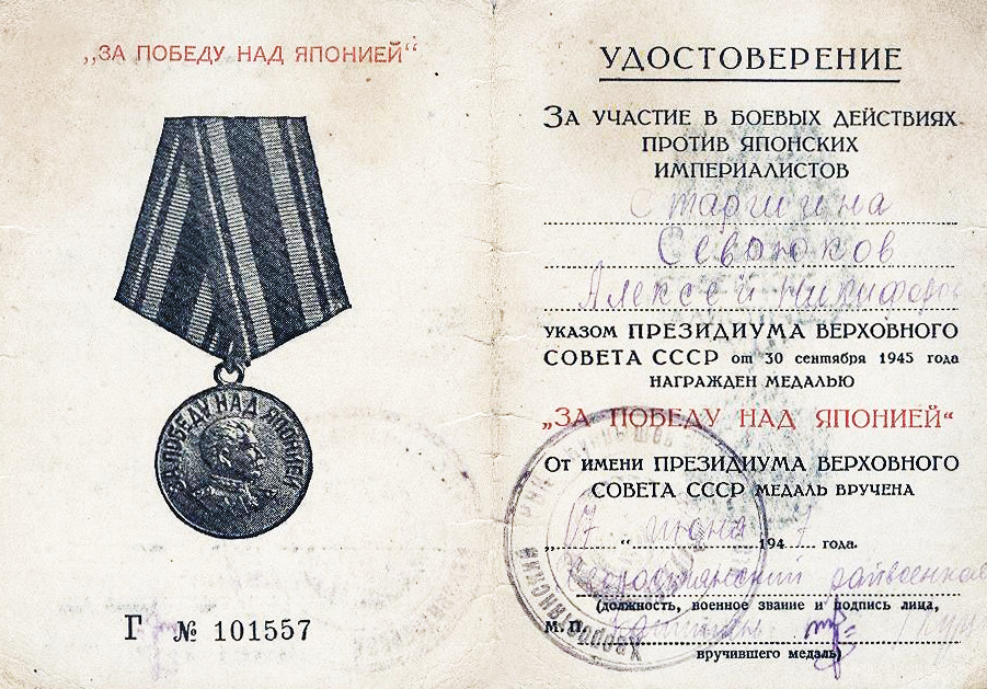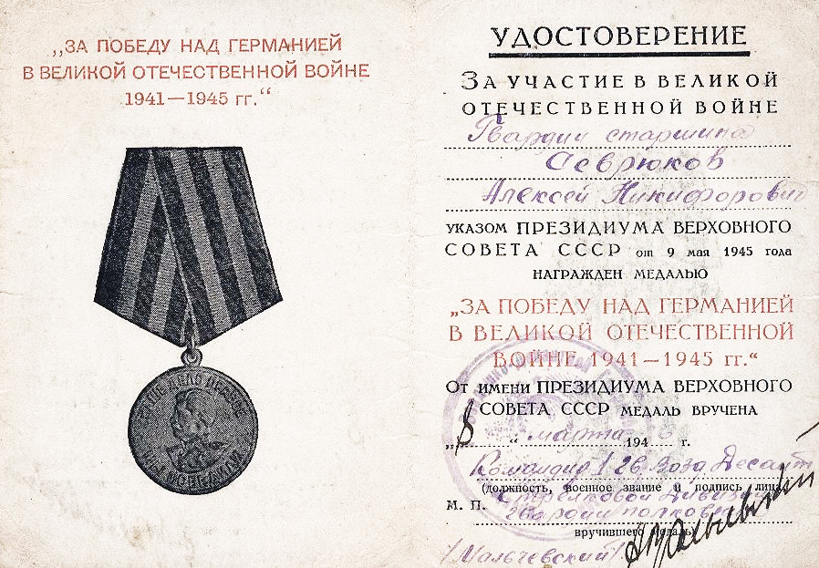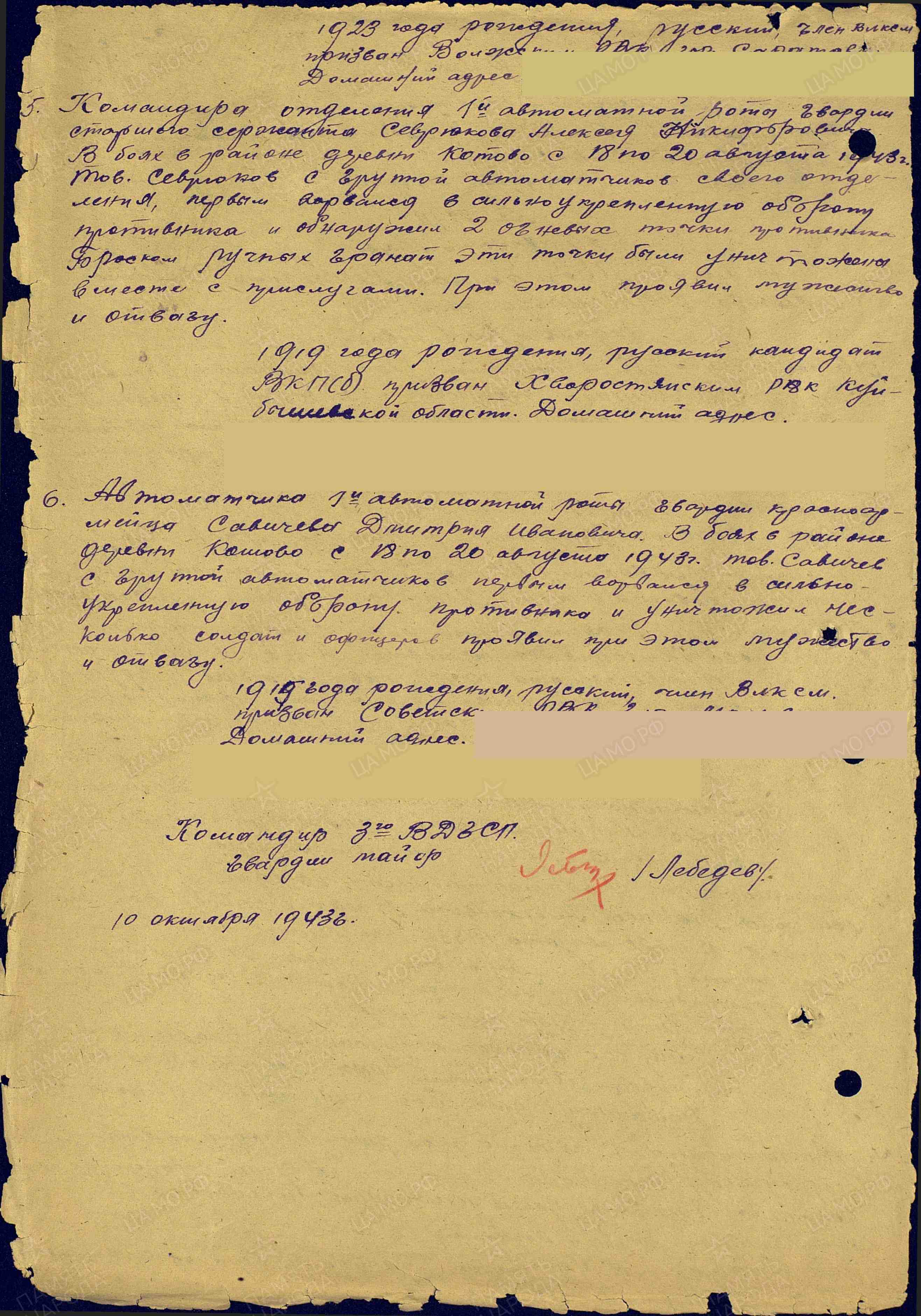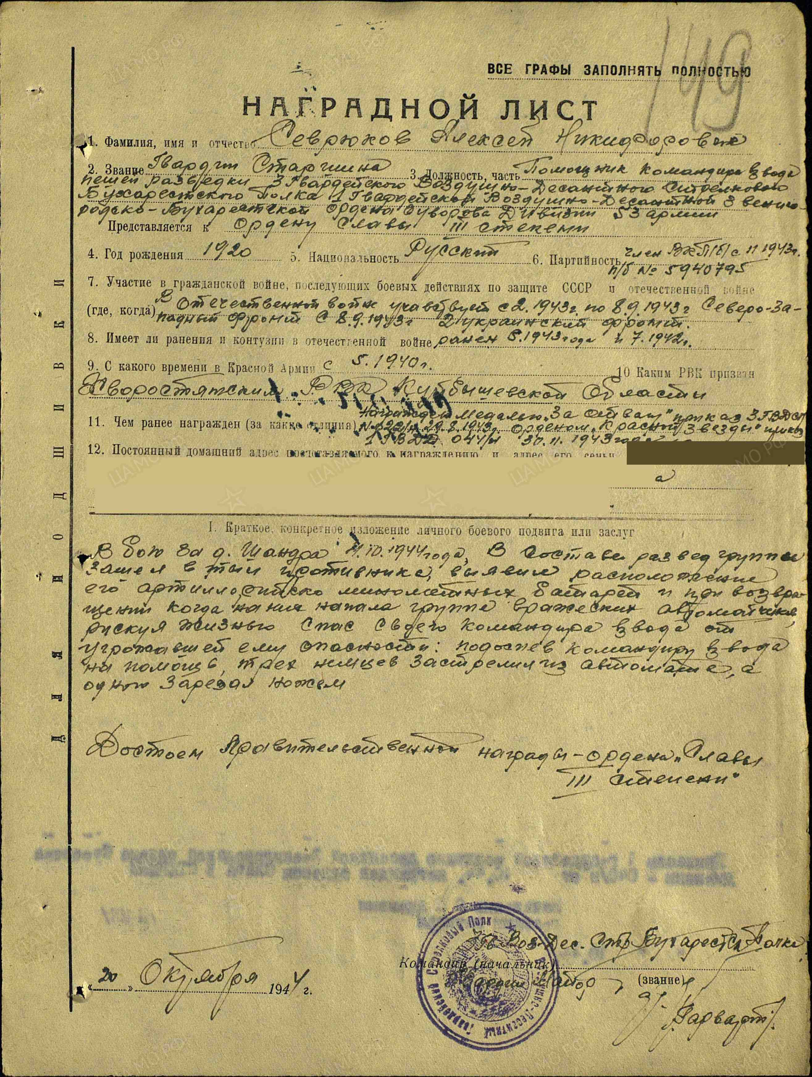 Наградить медалью «За отвагу» командира отделения 1-й автоматной роты, гвардии старшего сержанта Севрюкова Алексея Никифоровича. В боях в районе д. Котово с 18 по 20 августа 1943 г. тов. Севрюков с группой автоматчиков своего отделения первым ворвался в сильно укрепленную оборону противника и обнаружил 2 огневых точки противника. Броском ручных гранат эти точки были уничтожены вместе с прислугами. При этом проявил мужество и отвагу (наградной лист от 29.08.1943 г.).