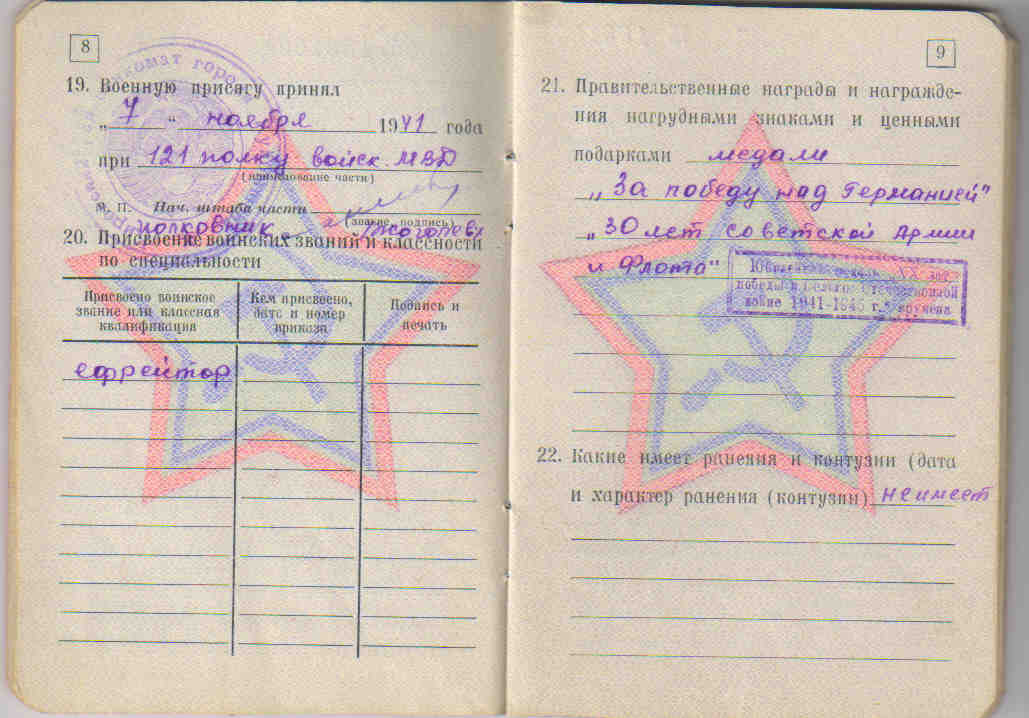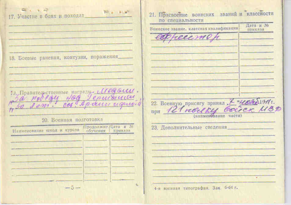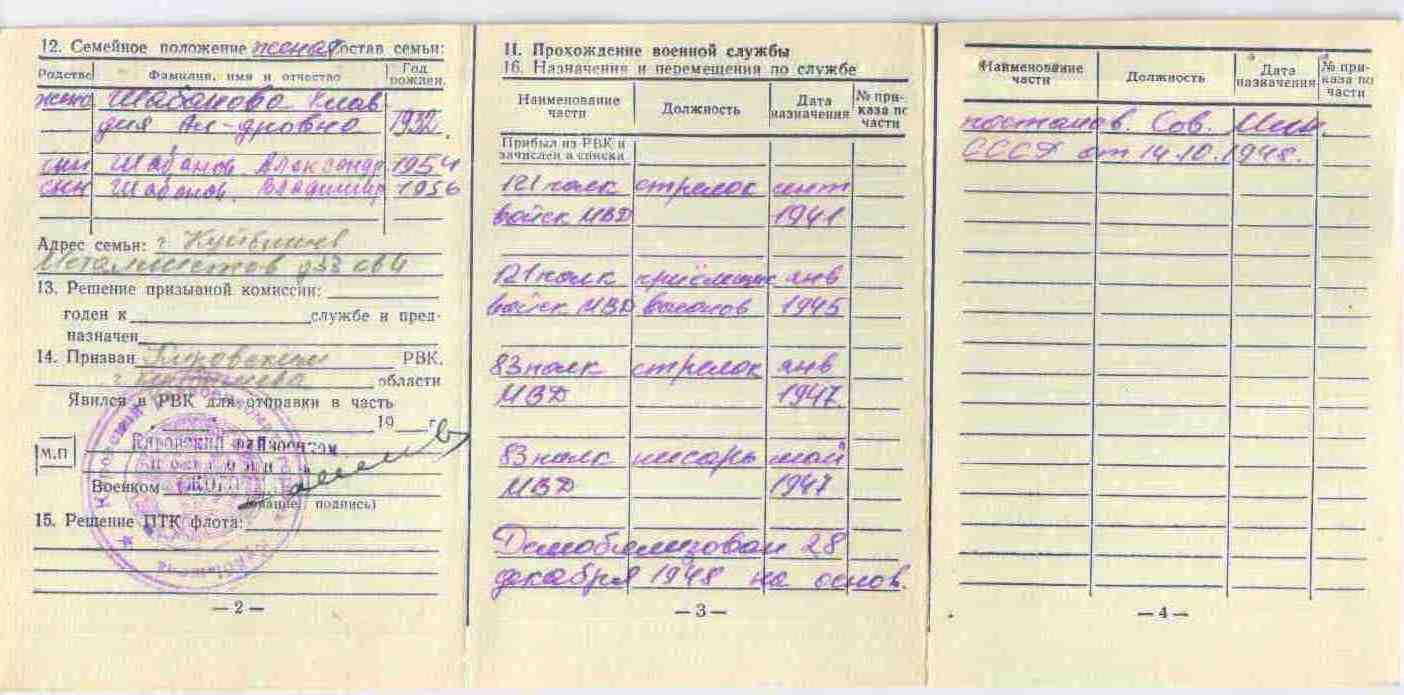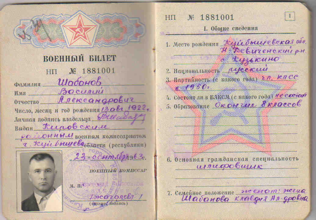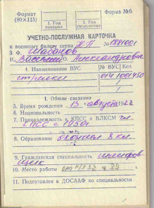 Из семейного архива Черновой К.А., г. Самара Самарской областиОкончил 8 классов. Призван на военную службу Новодевиченским РВК и направлен в часть 15.09.1941 г. На фронте был стрелком, воинское звание ефрейтор.