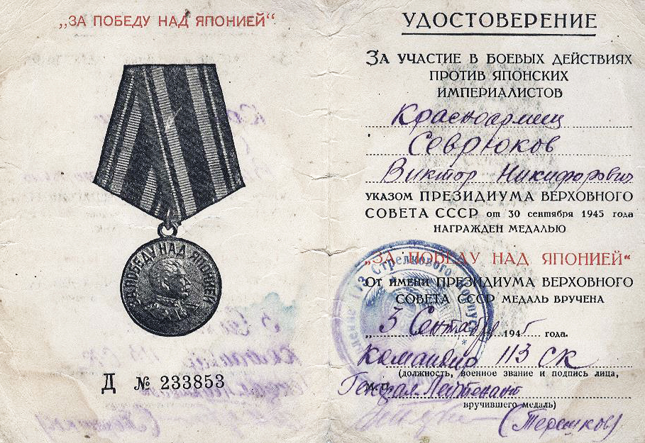 Севрюков Виктор Никифорович имел звание младший сержант. С февраля 1944 г. по июнь 1945 г. служил телефонистом в 240-м западном стрелковом полку, пулемётчиком в 940-м стрелковом полку с июня 1945 года по май 1945 года, в 30-м отдельном батальоне связи был телефонистом линейный кабельной линии с 1945 года по 1947 год. Награжден медалью «За победу над Японией». Виктор Никифорович Севрюков умер 14 января 2009 года.