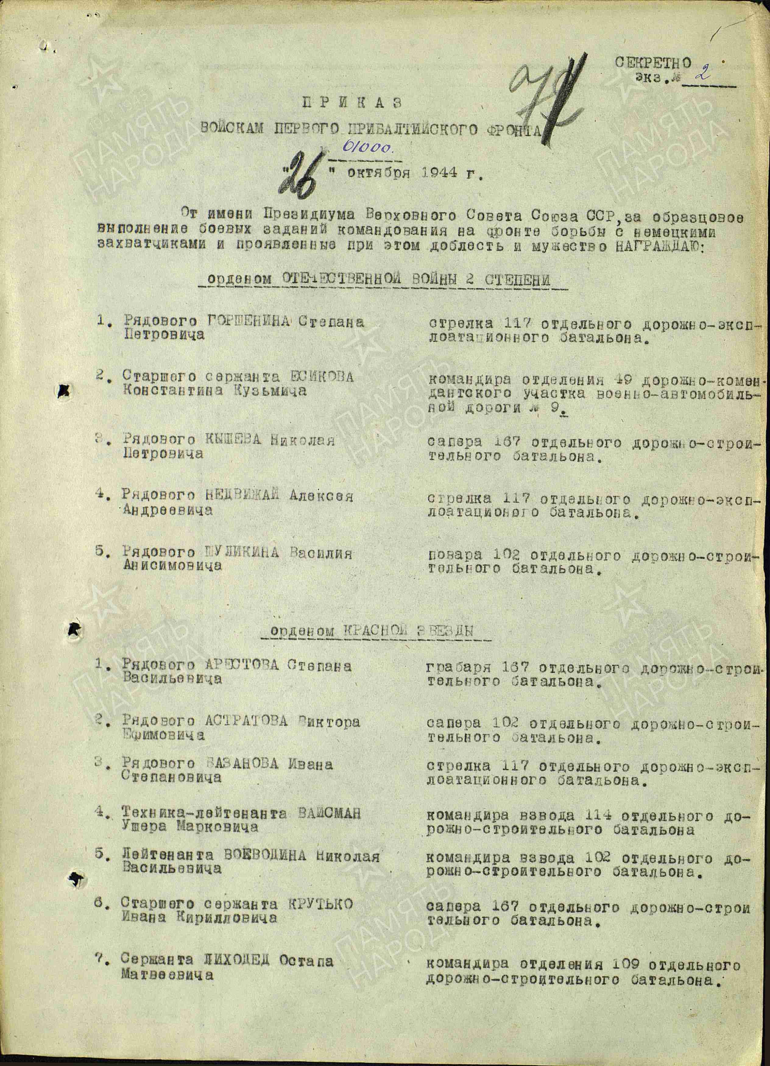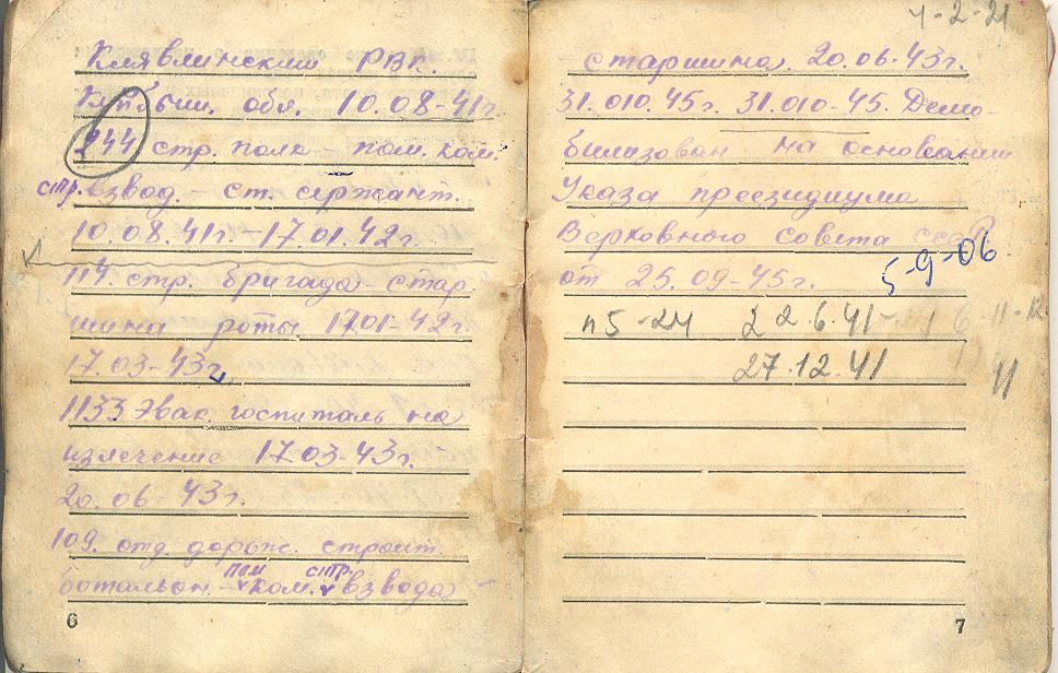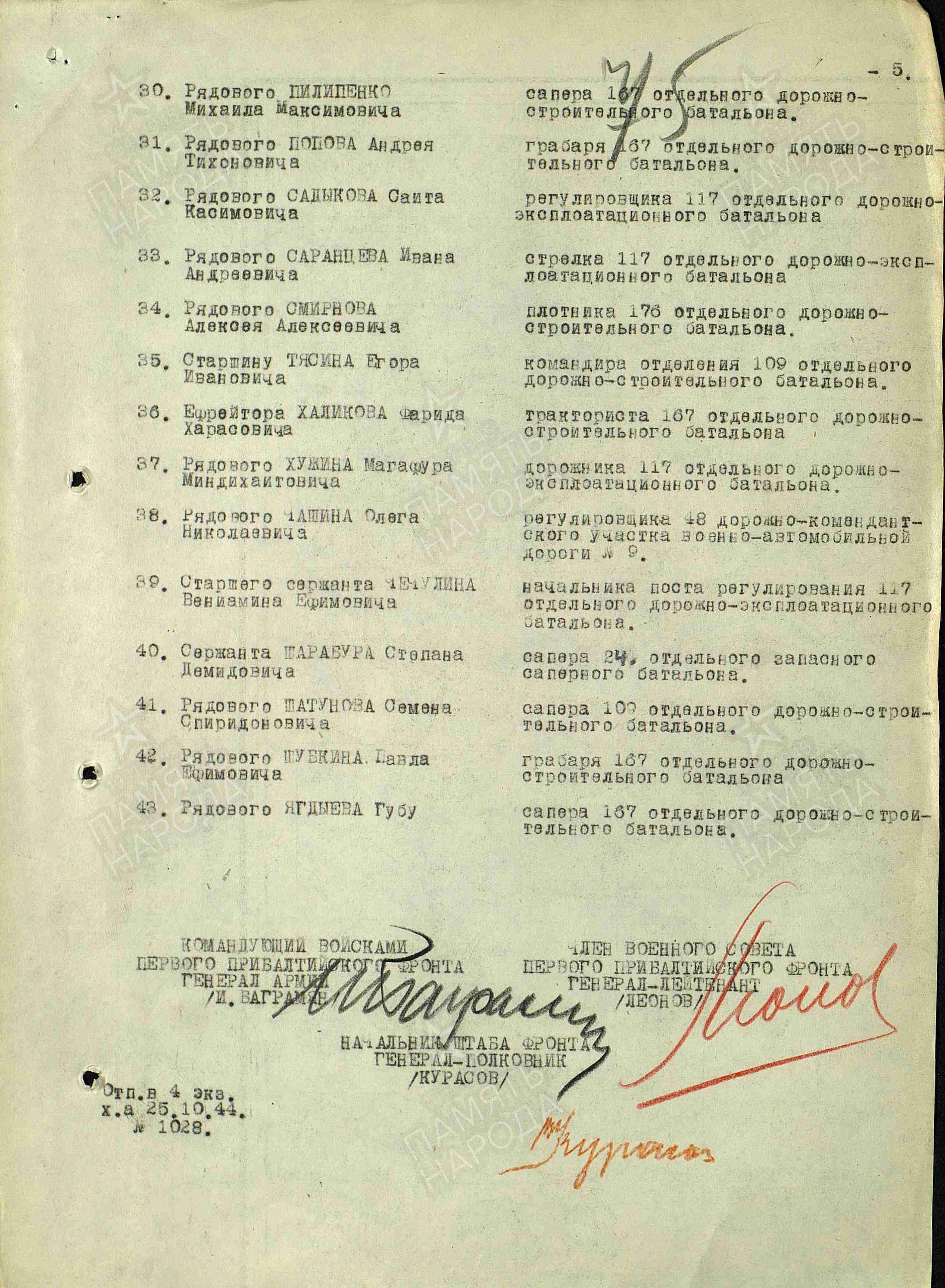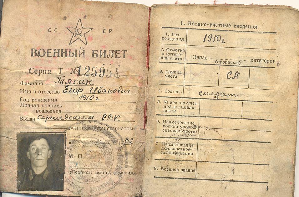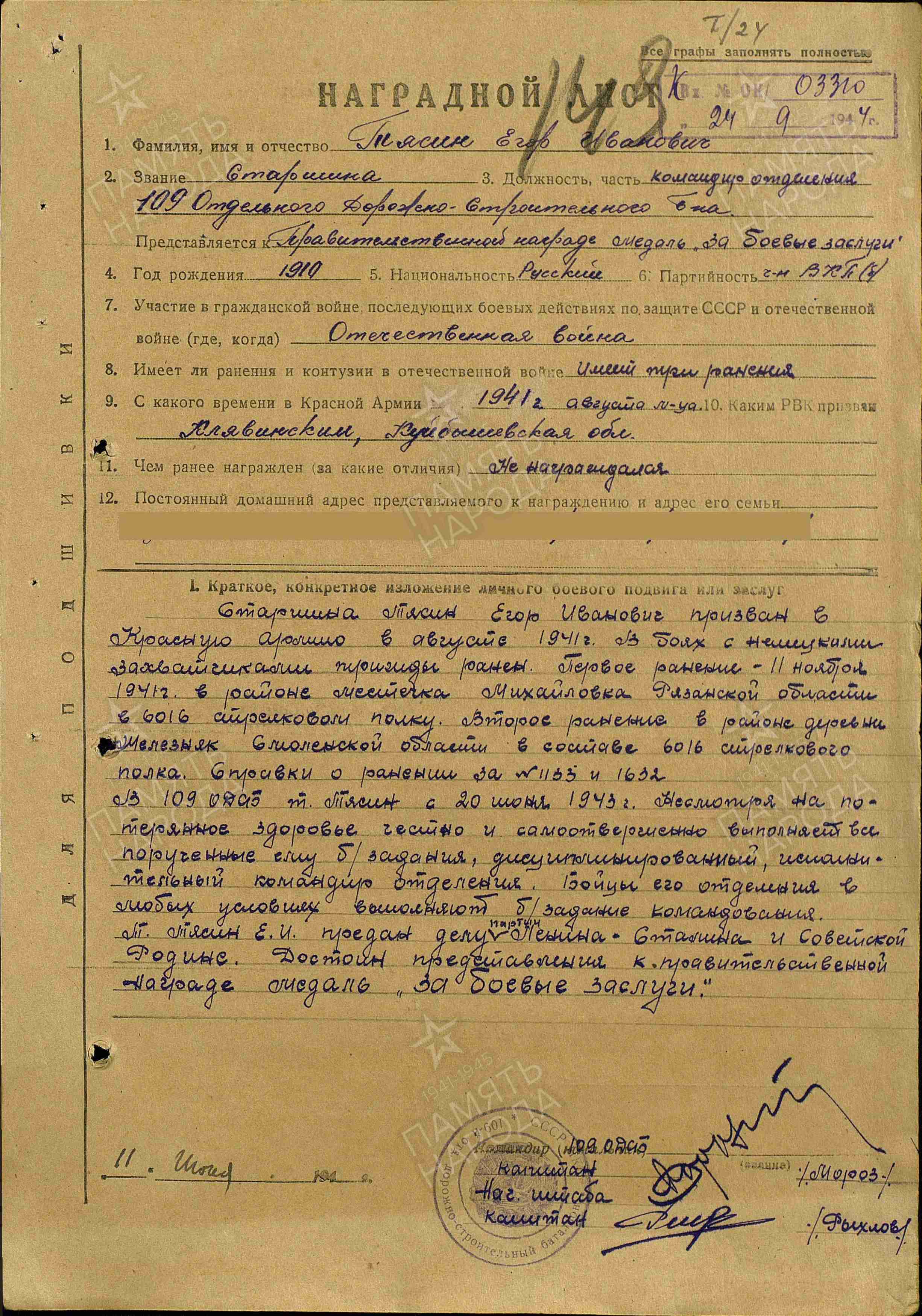 Информация из Наградного листа от 11.07.1944 г. к медали «За боевые заслуги»: «Старшина Тясин Егор Иванович призван в Красную Армию в августе 1941 г. В боях с немецкими захватчиками трижды ранен. Первое ранение – 11 октября 1941 г. в районе местечка Михайловское Рязанской области. Второе ранение в районе деревни Железняк Смоленской области в составе 6016 стрелкового полка. Справки о ранении за №1135 и 1632. В 109 ОДСБ (отдельного дорожно-строительного батальона) тов. Тясин с 20 июня 1943 г. Несмотря на потерянное здоровье честно и самоотверженно выполняет все порученные ему б/задания, дисциплинированный, исполнительный командир отделения. Бойцы его отделения в любых условиях выполняют б/задания командования».