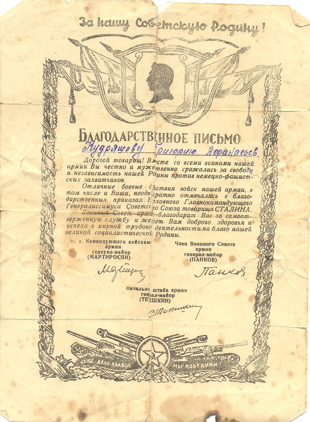 Кудряшов Григорий Афанасьевич был призван в Армию в Исаклинском райвоенкомате 10 января 1943 года. Он был зачислен в 3-е Куйбышевское военно-пехотное училище. В составе 302-го гвардейского стрелкового полка 18 июня 1944 г. Григорий Афанасьевич принимал участие в форсировании реки Свирь в районе Лодейного поля, освобождая города Олонец и Видлица, Карелию. 11 июля 1944 года был ранен. В ноябре 1944 г. в составе321-го гвардейского стрелкового полка принимал участие в боях с фашистами на 2-м Белорусском фронте, в освобождении Польши. 14 марта 1945 г. на подступах к городу Гдыня Г.А. Кудряшов был ранен вторично. Находился на излечении в г. Руммельсбург. Здесь и встретил День Победы. Награжден медалью за «Оборону Советского Заполярья» (1945 г.). Григорий Афанасьевич умер 24 июня 2002 года.