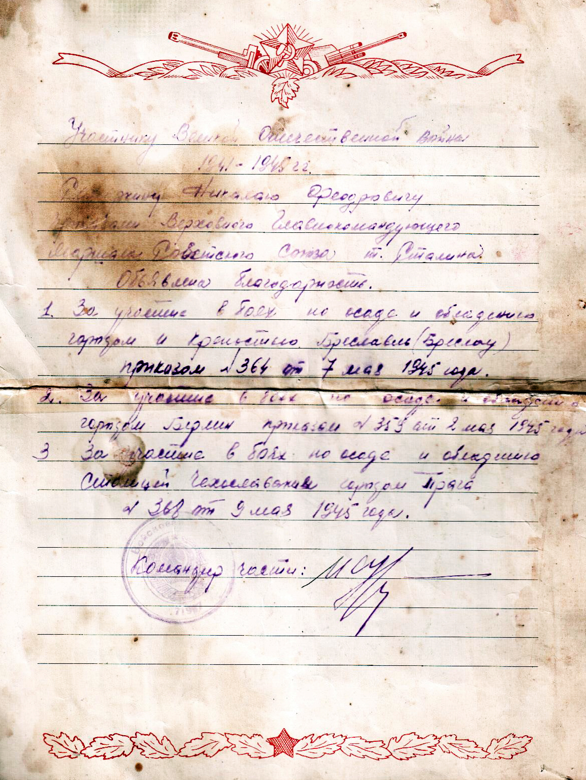 Благодарственная грамота, Самаркин Н.Ф., 1945 год