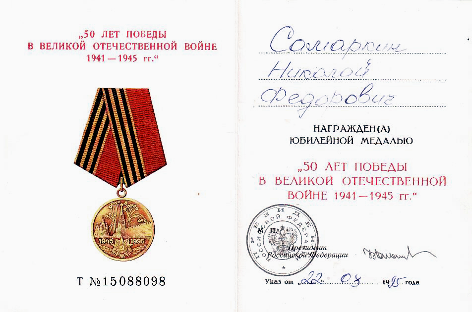 Удостоверение к медали «50 лет победы в Великой Отечественной войне 1941-1945 гг», Самаркин Н.Ф.