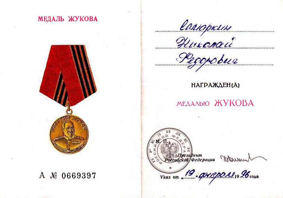 Удостоверение к медали Жукова, Самаркин Н.Ф.