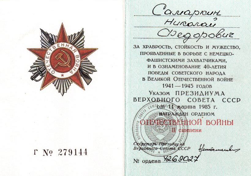Орденская книжка к ордену Отечественной войны 2-ой степени, Самаркин Н.Ф.