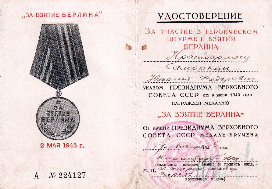 Удостоверение к медали «За взятие Берлина», январь 1946 г., Самаркин Н.Ф.