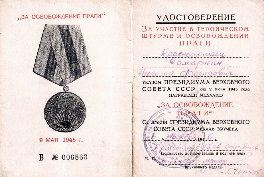 Удостоверение к медали «За освобождения Праги», ноябрь 1946 г., Самаркин Н.Ф.
