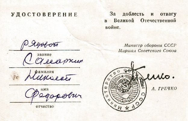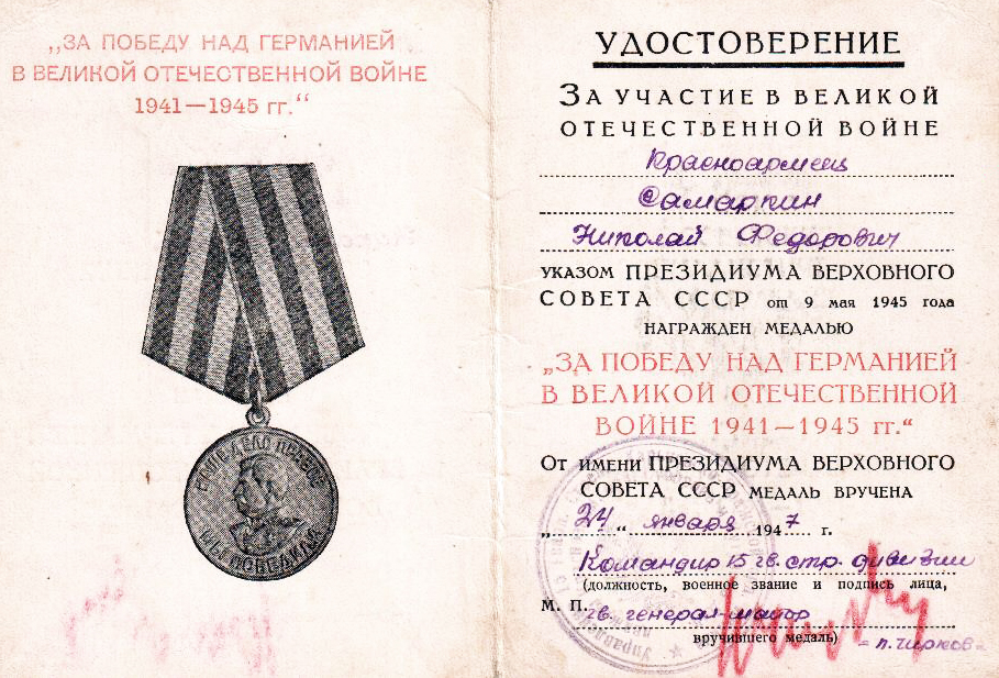 Удостоверение к медали «За победу над Германией в Великой Отечественной войне 1941-1945 гг.», 24 января 1947 г., Самаркин Н.Ф.