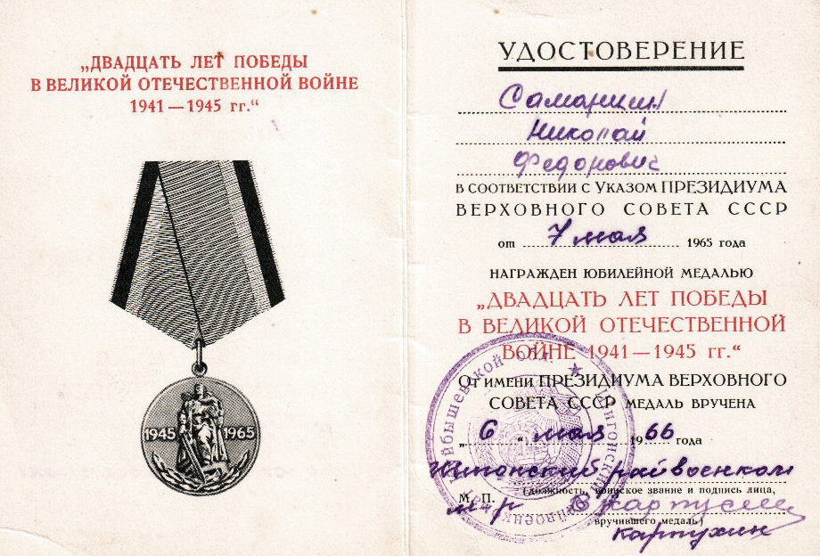 Удостоверение к медали «20 лет победы в Великой Отечественной войне 1941-1945 гг», Самаркин Н.Ф.
