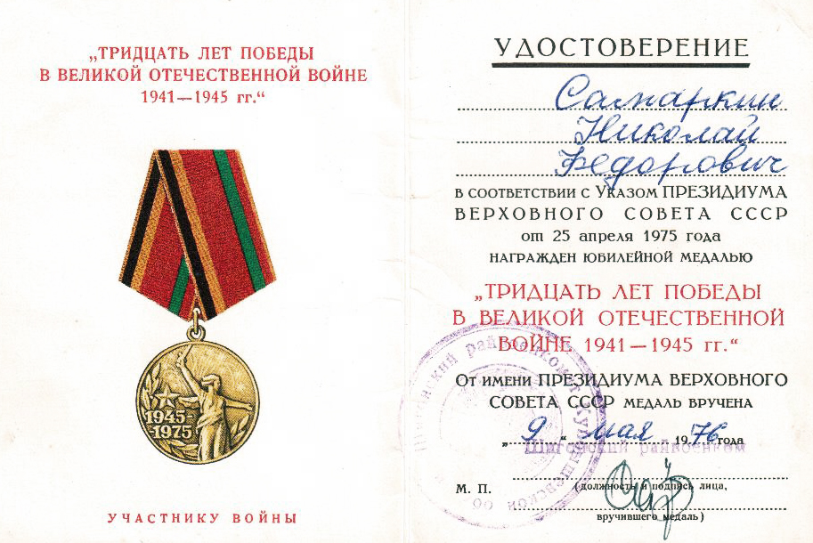 Удостоверение к медали «30 лет победы в Великой Отечественной войне 1941-1945 гг», Самаркин Н.Ф.