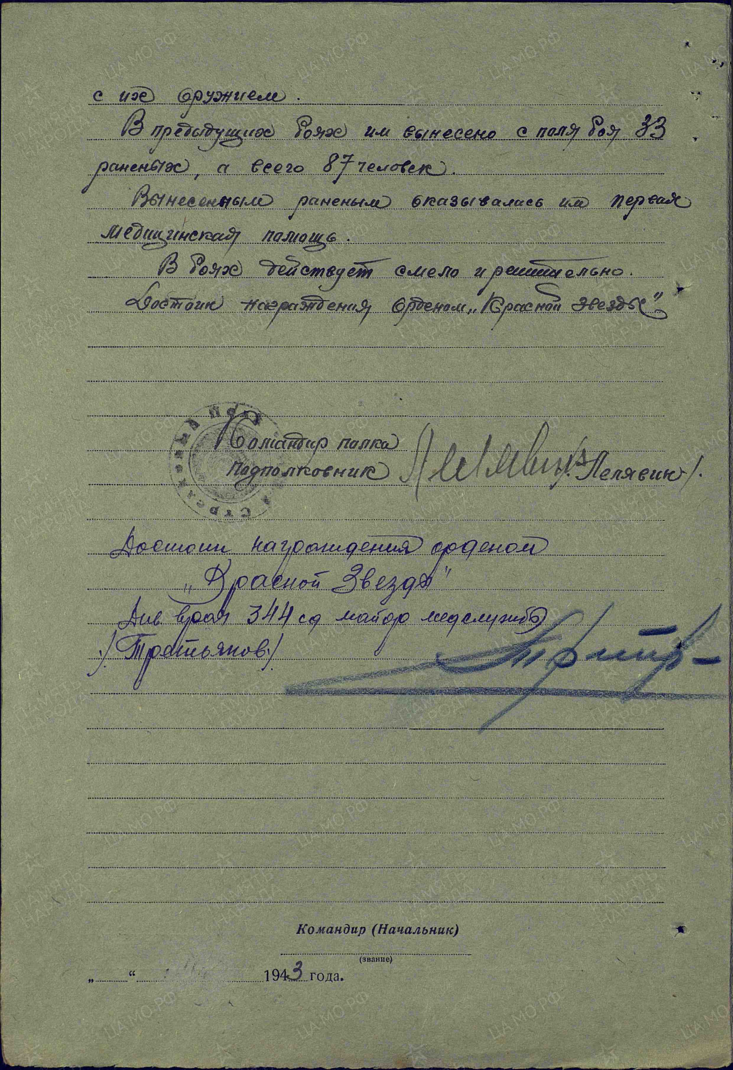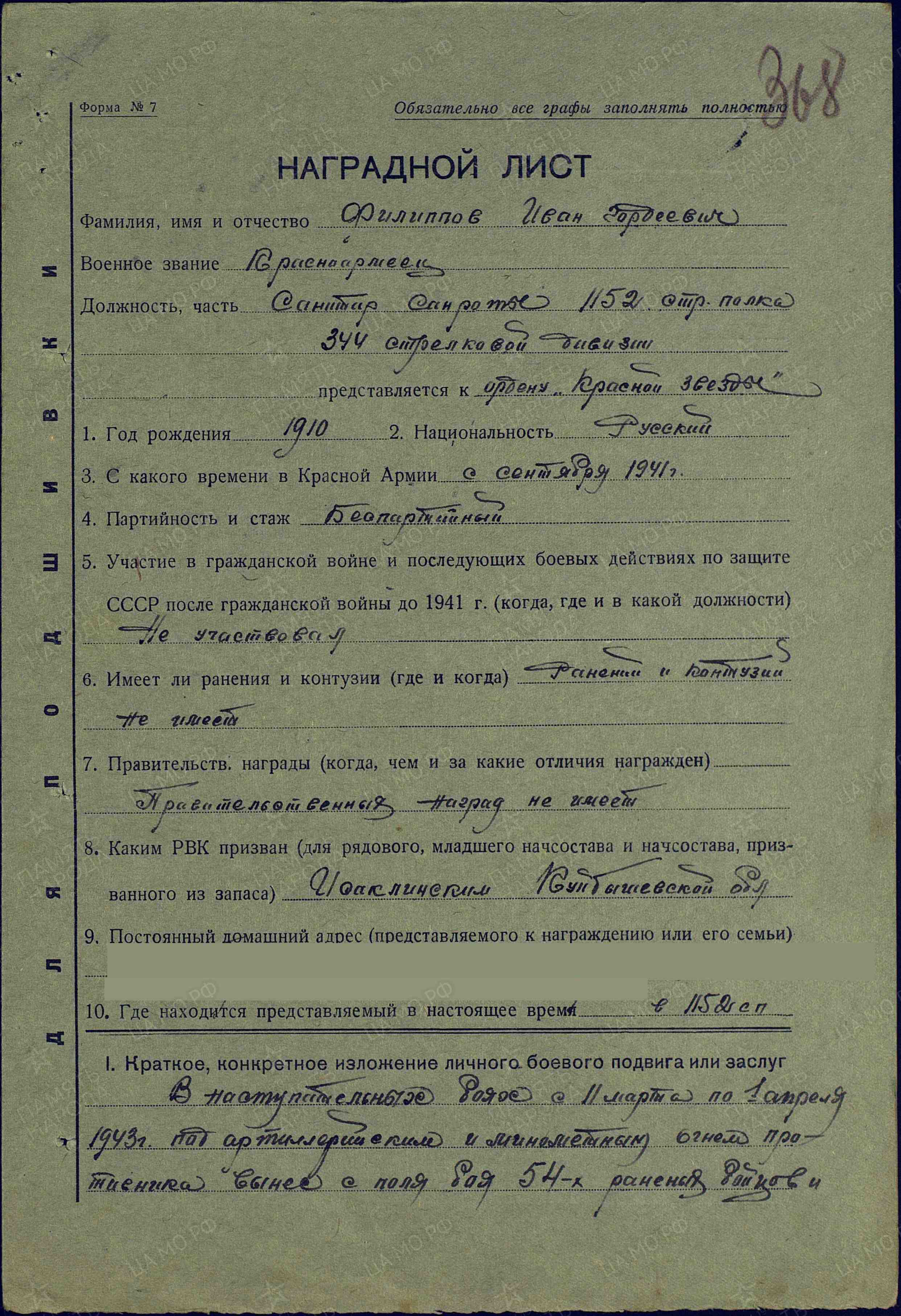 В наступательных боях с 11 марта по 1 апреля 1943 г. под артиллерийским и минометным огнем противника вынес с поля боя 54 раненых бойца с их оружием. В предыдущих боях им вынесено с поля боя 33 раненых, а всего 87 человек. Вынесенным раненым оказывалась первая медицинская помощь. В боях действует смело и решительно. Достоин награждения орденом Красной Звезды (наградной лист от 30.07.1943 г.).