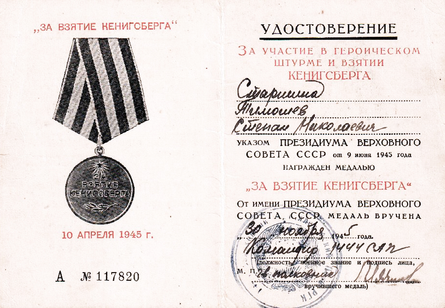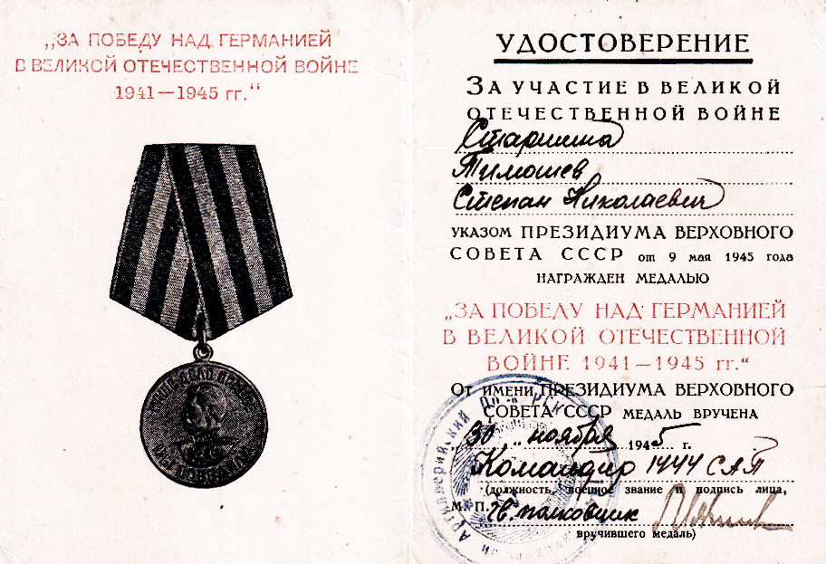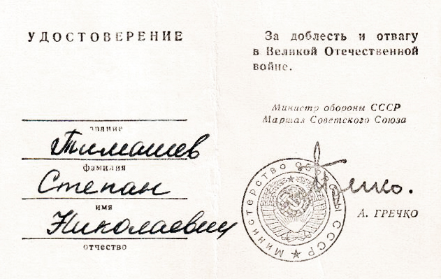 Информация с сайта podvignaroda.ru: «За два года жизни и боевой деятельности полка показал образцы работы и отваги в деле разгрома немецко-фашистских захватчиков. В боях за г. Орел и Гомель под сильным артиллерийско-минометным и действительным ружейно-пулеметным огнем обеспечивал боевые экипажи горячей пищей. В боях за г. Гродно и Осовец под артминогнем и бомбометанием противника по бездорожью также сумел своевременно обеспечивать боевые экипажи пищей и всем необходимым. В бою смел и энергичен. Несмотря на трудные полевые условия, поставил отличный учет и отчетность по ПФС и ОВС, в результате чего снабжение продовольствием и вещевым имуществом полка в боевых действиях было обеспечено хорошо. Кроме того, тов. Тимашев при прорыве сильно укрепленной оборонительной линии противника на р. Зуша, форсировании ее и ведения боевых действий полка за г. Орел и Брянск, по собственной инициативе (во время недостатка транспорта и людей) 15, 19, 25 июля и 6, 14, 29 августа 1943 года под сильным действительным арт. руж. пулеметным огнем противника носил в термосах горячую пищу боевым экипажам непосредственно на поле боя. Затем, при форсировании р. Сож и расширении плацдарма на западном берегу р. Сож севернее Гомеля также 14, 16, 18 и 22 ноября 1943 года под сильным действительным ружейно-пулеметным огнем противника по собственной инициативе носил в термосах горячую пищу к боевым экипажам непосредственно на поле боя. 28.7.43 года при бомбометании авиацией противника был разрушен прод. склад. Тов. Тимашев бросился на помощь зав. складом спасать продукты от возникающего пожара, несмотря на продолжающиеся бомбардировки. В наступательных боях в Восточной Пруссии показал себя смелым и решительным. Работая старшим писарем хозчасти, несмотря на близость размещения хозчасти полка к переднему краю, всю документацию оформлял аккуратно и своевременно. В боях за г. Кенигсберг под сильным артогнем противника доставлял горячую пищу боевым экипажам непосредственно в боевые порядки, неоднократно под огнем противника производил раздачу продуктов питания личному составу. Своей упорной работой и отвагой содействовал успешному выполнению боевых задач, поставленных полку». Награды: орден Отечественной войны II степени, медали «За Победу над Германией в Великой Отечественной войны 1941-1945 гг.», «За взятие Кенигсберга», «25 лет Победы в Великой Отечественной войны 1941-1945 гг.», «За отвагу», «За боевые заслуги». Тимашев Степан Николаевич умер 16.10.1989 г.